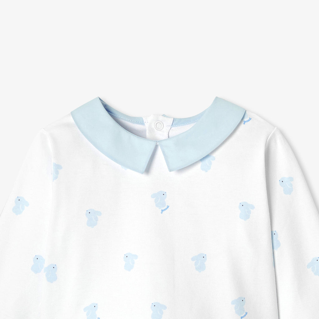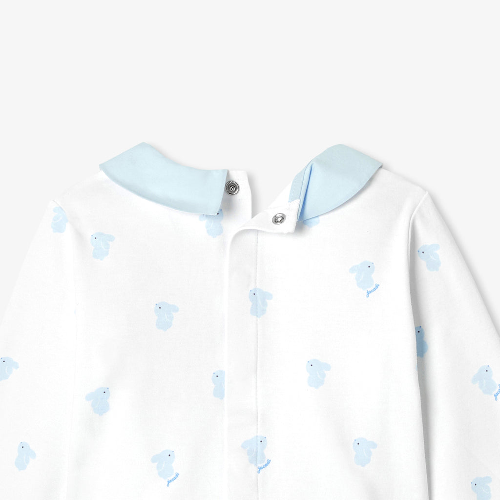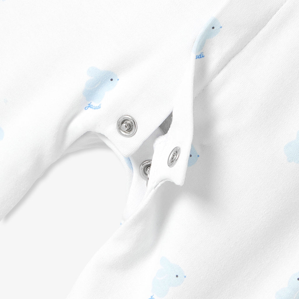 生まれたその瞬間から赤ちゃんをやさしく包み込む、インターロック素材のパジャマです。愛らしいうさぎ柄が、上品でやさしい表情を添えます。