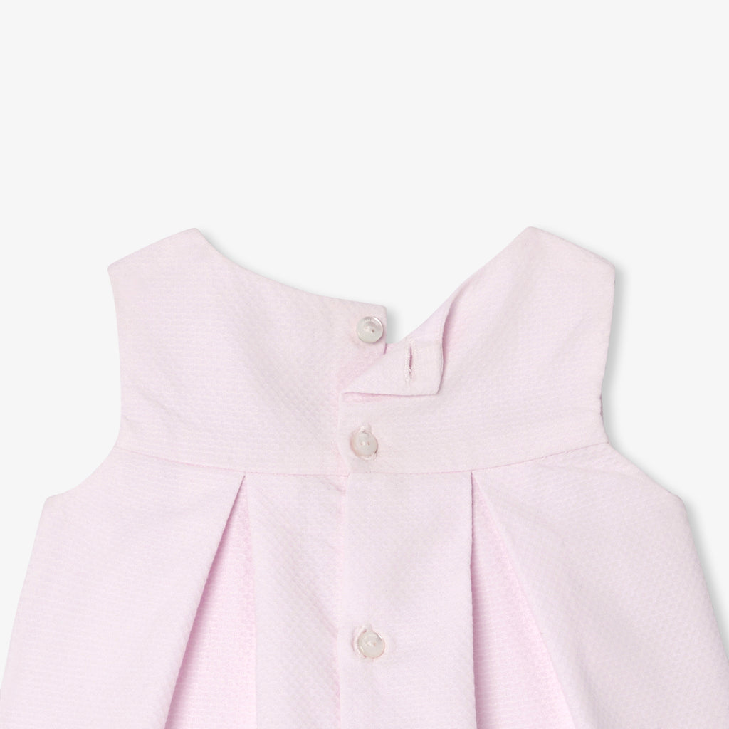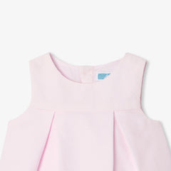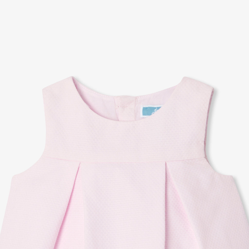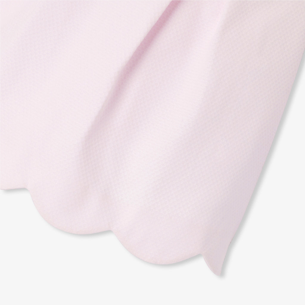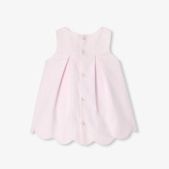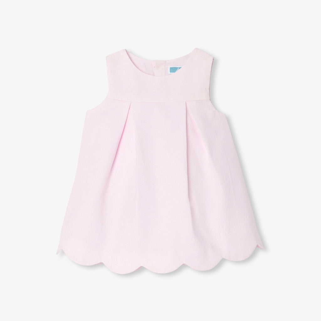 ジャカディらしい、定番のワンピースです。上品なコットンピケ素材にポプリン裏地を合わせ、スカラップ裾とボックスプリーツを施しました。
