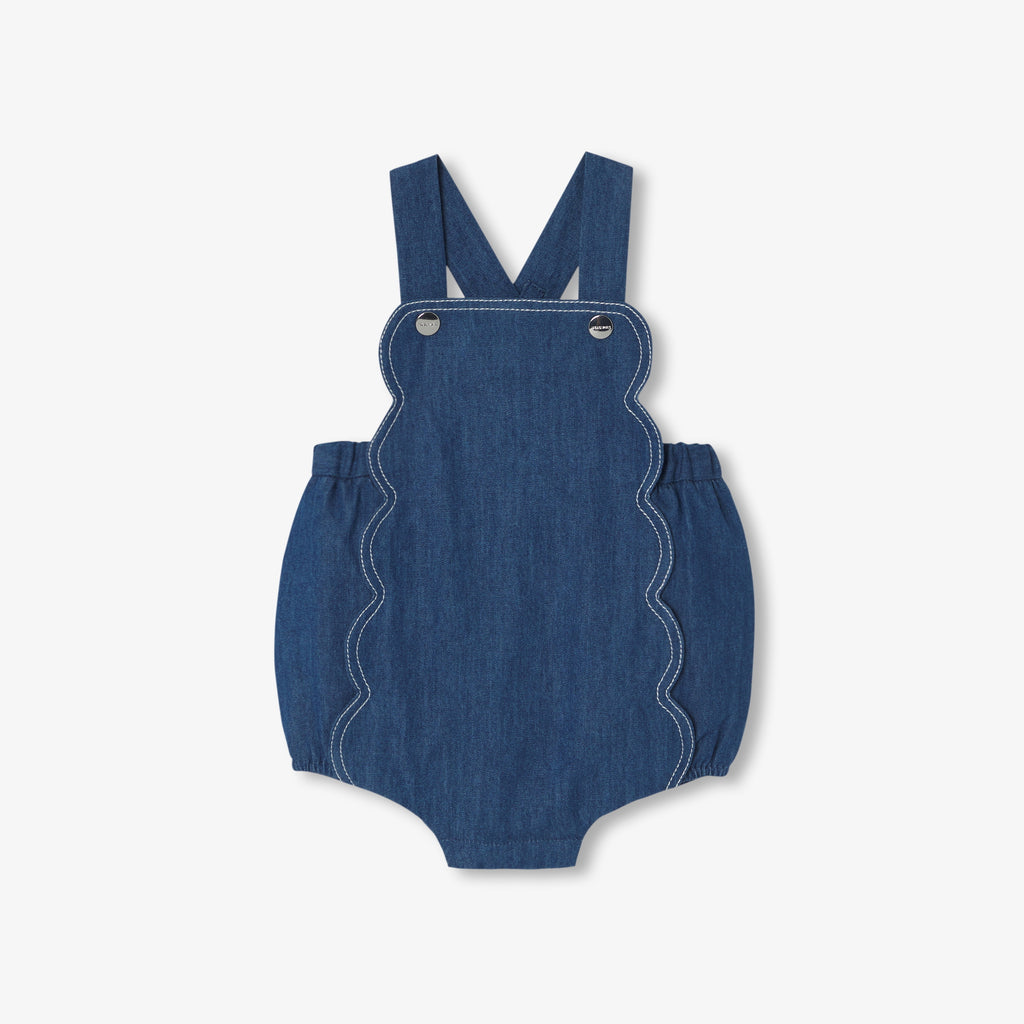 軽やかでしなやかなデニム素材を使用した、夏らしい印象のロンパースです。スカラップの胸当てにコントラストの効いたコバステッチを施し、背面のギャザーで程よいボリューム感をプラス。
