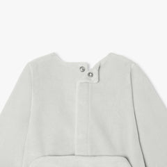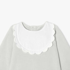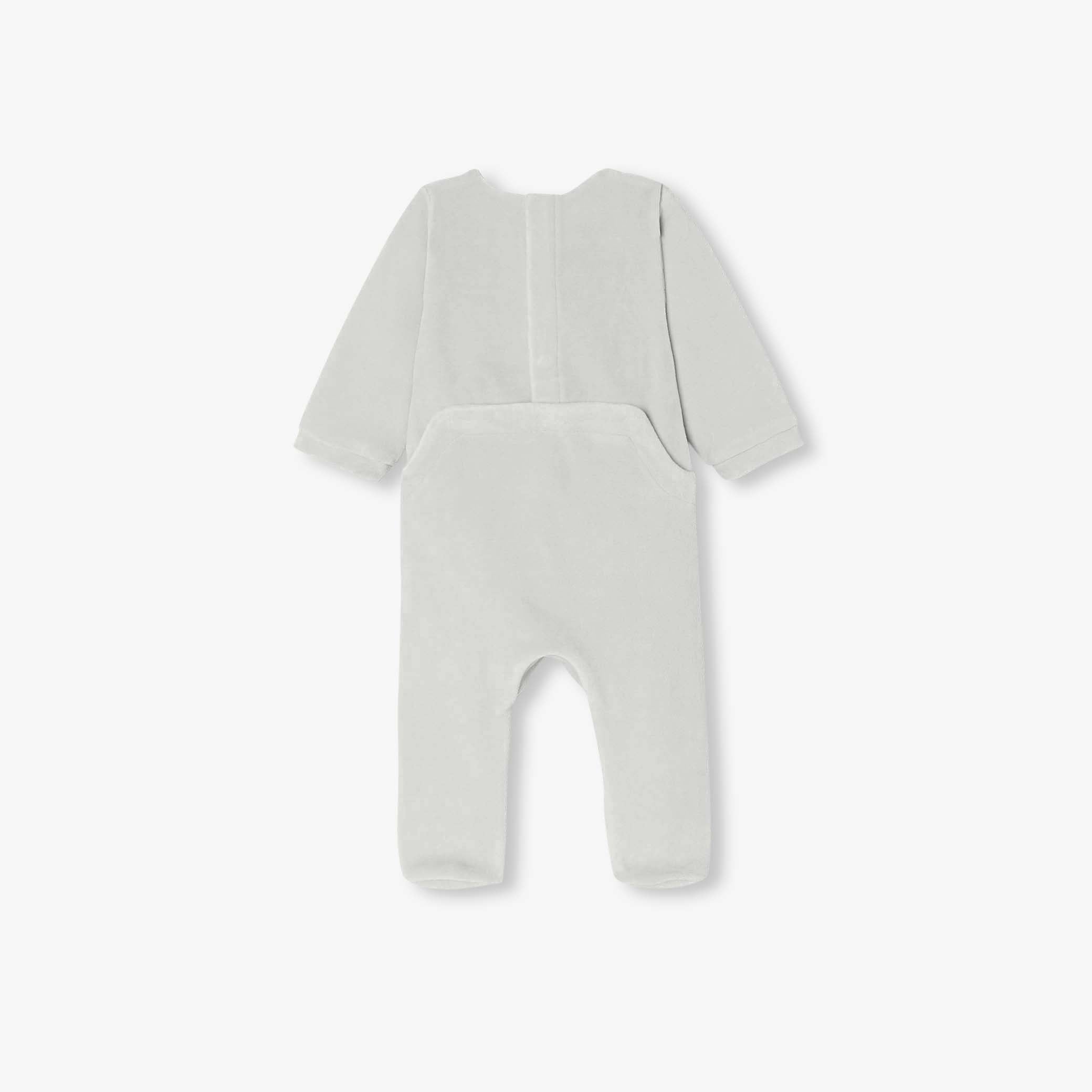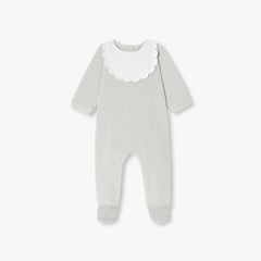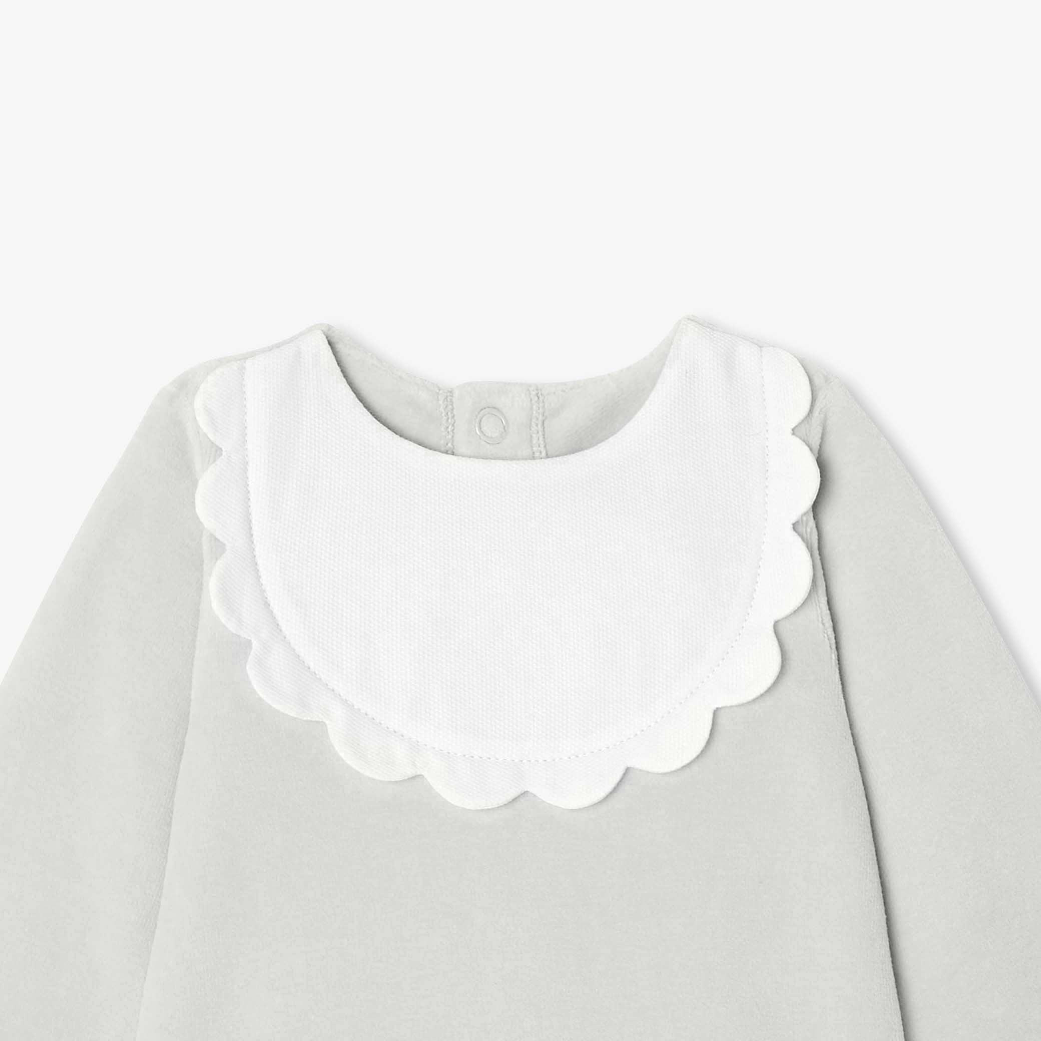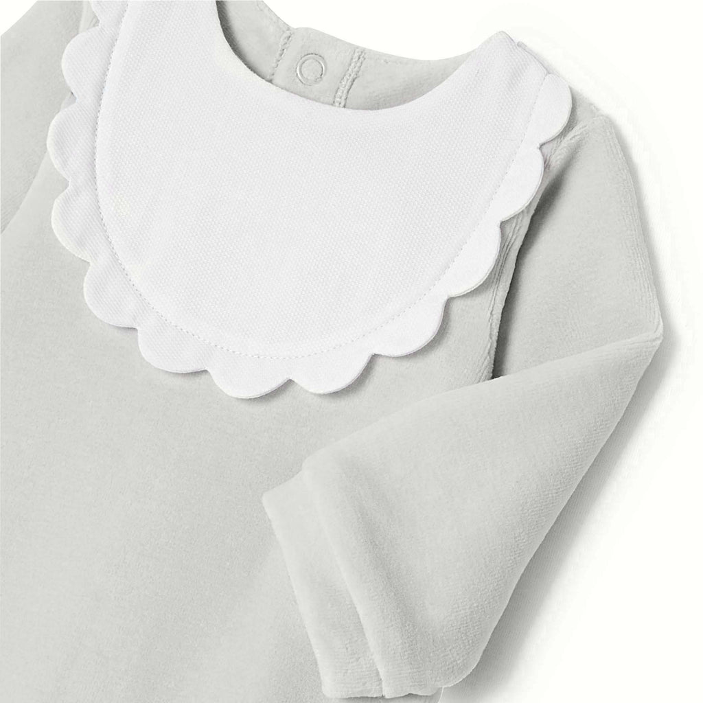 秋からのシーズンに、赤ちゃんの夜を快適にしてくれる足つきロンパース・パジャマ。エレガンスと実用性を兼ね備えた魅力たっぷりのモデルで、柔らかくしなやかなベロア調生地を使用しています。正面のスカラップが可愛らしく、目立ちにくい背面のスナップボタンで着脱も簡単。ワードローブの必需品となりそう。