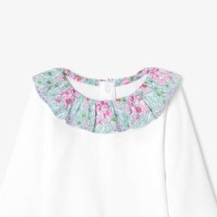 エレガントなリバティプリント(花柄)のフリルが美しいシックな長袖ボディスーツ。今シーズンのスタイルに欠かせない、柔らかでしなやかなオーガニックコットン製の一着です。着脱も簡単で、サロペットやお揃いのリバティブルマ(別売り)と合わせれば、フローラルでロマンチックなシルエットが完成します。