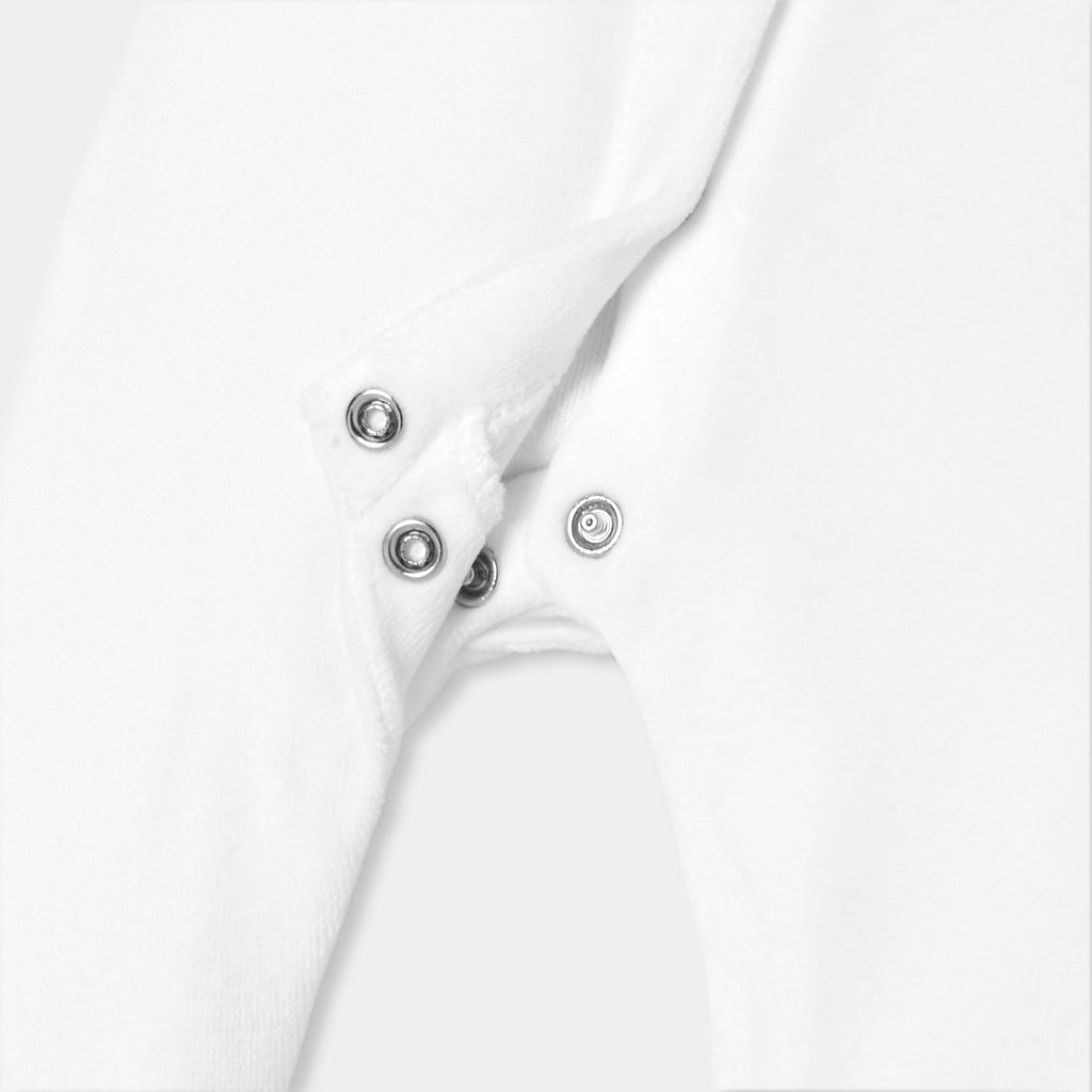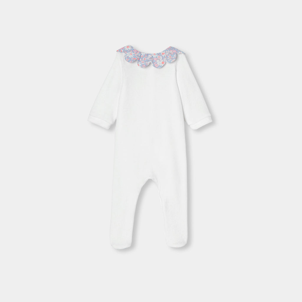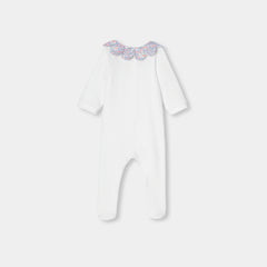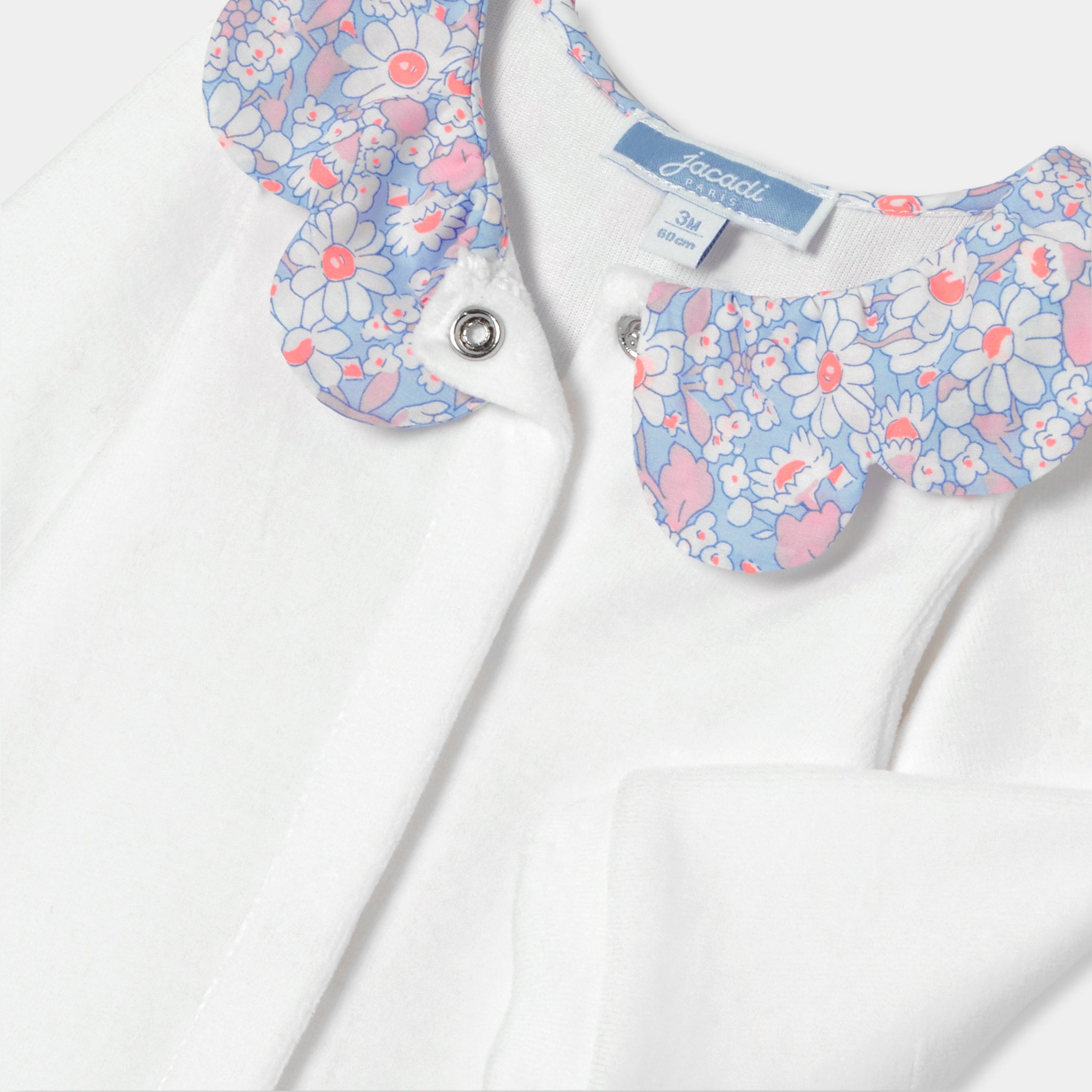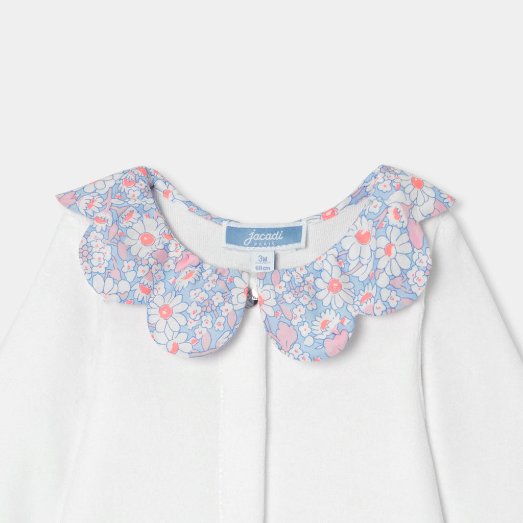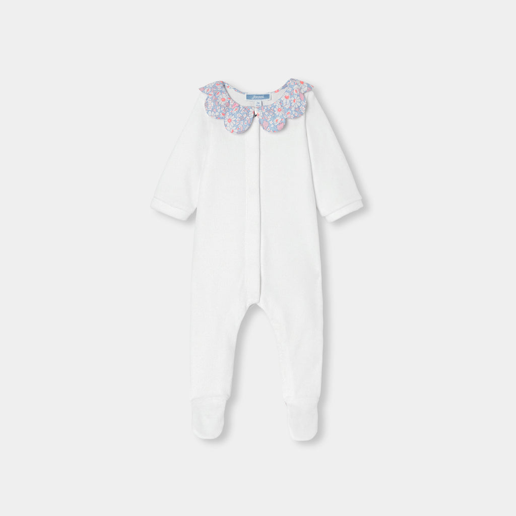 夜のワードローブに欠かせない、フラワーモチーフの可愛らしいスリムデザインの足つきロンパース・パジャマ。襟と足元のリバティプリント(花柄)が印象的で実用性の高いモデルです。柔らかで着心地の良いベロア調生地を使用しており、目立ちにくい正面のスナップボタンで着脱も簡単。すやすやと眠る赤ちゃんを優しく快適に包み込みます。