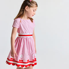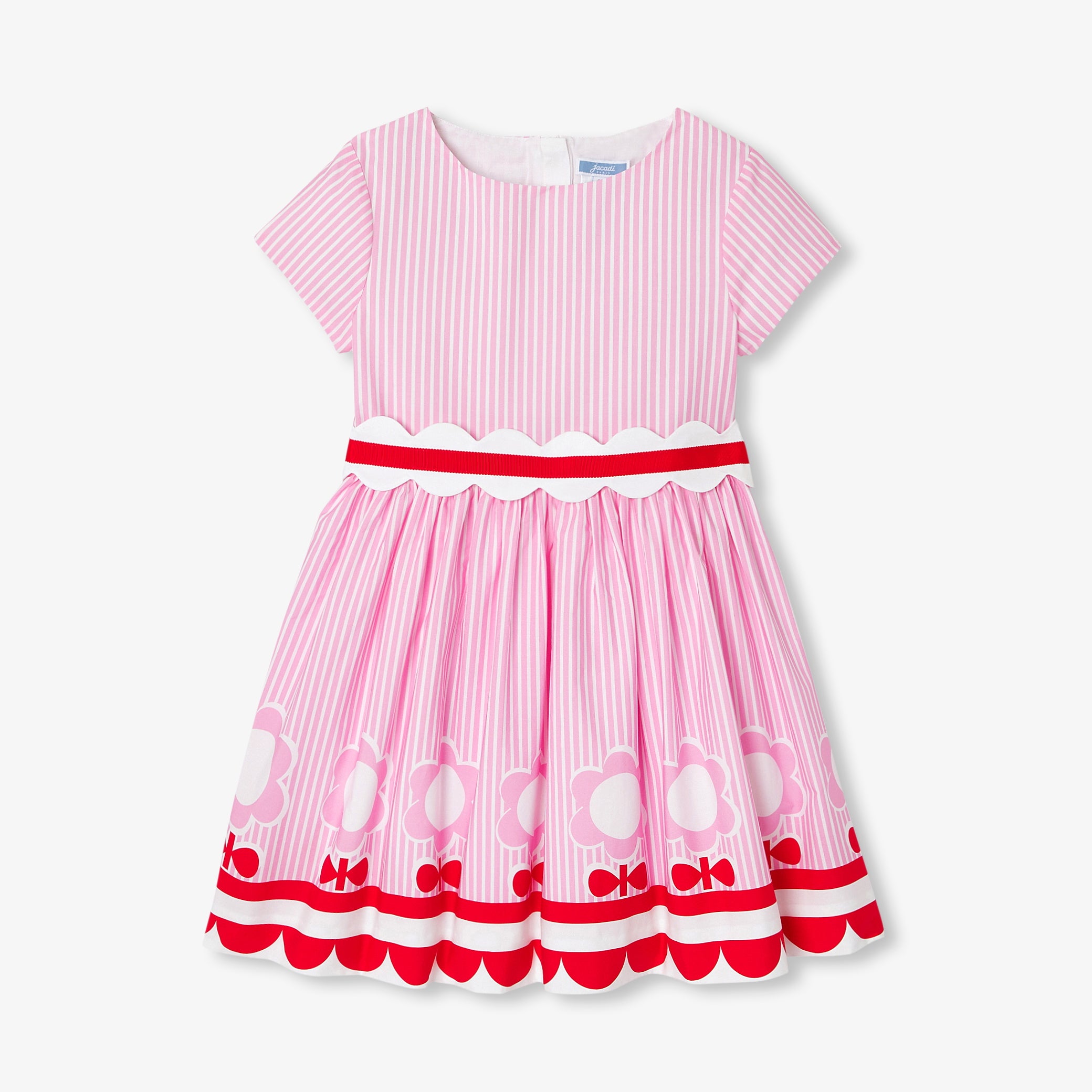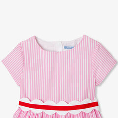 今シーズンの人気アイテム、半袖ポプリンワンピース。幾何学的なストライプと花柄を組み合わせ、スカラップでアクセントを添えました。