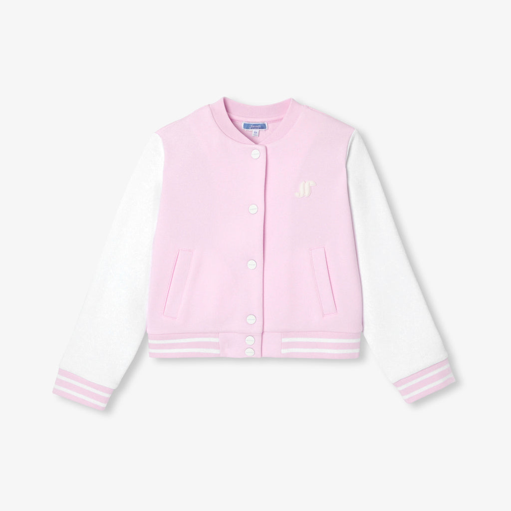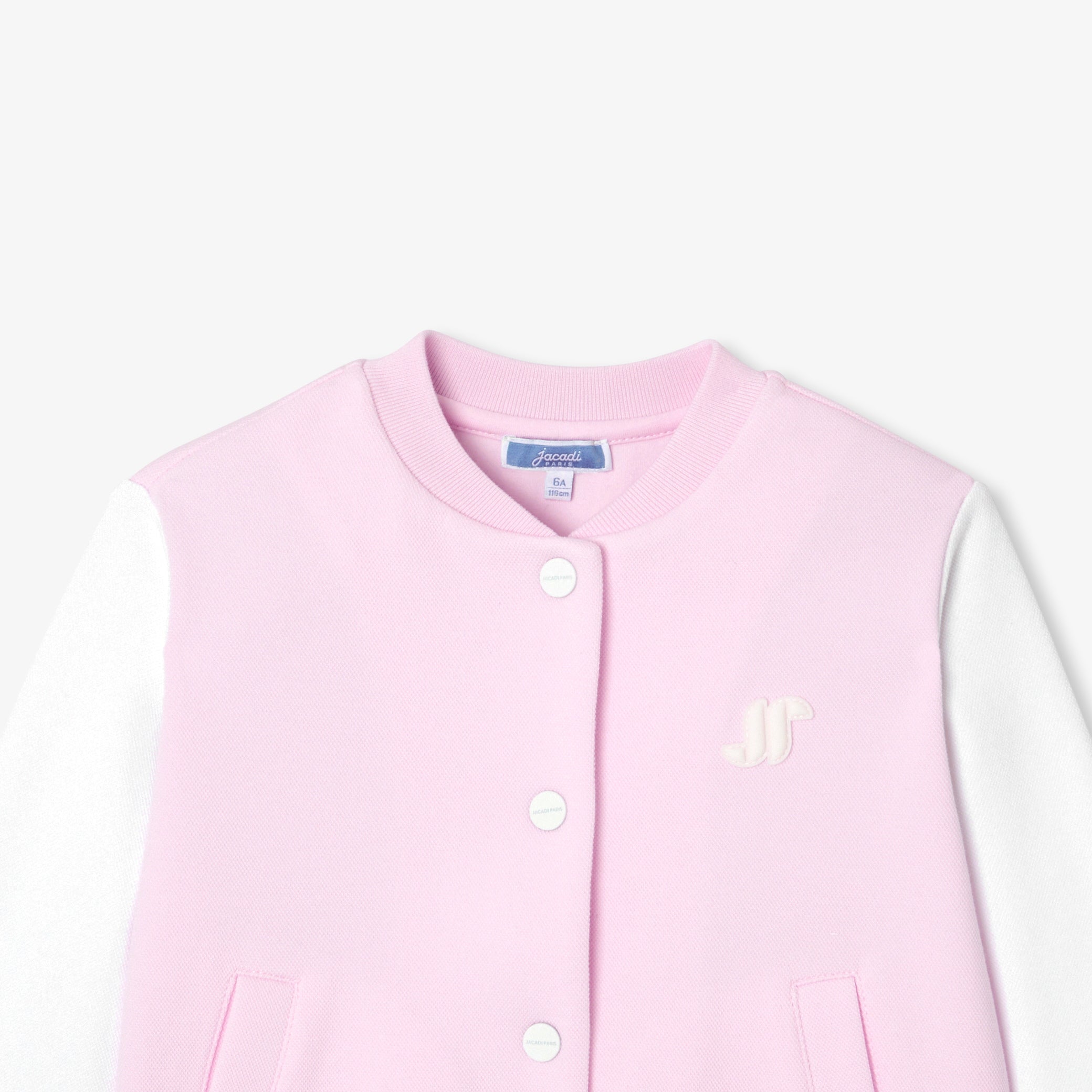コントラストの効いたカラーブロックデザインの袖、胸元のバッジ、スナップボタン、ストライプのリブ編みのディテールが新鮮な印象のモダンな一着です。