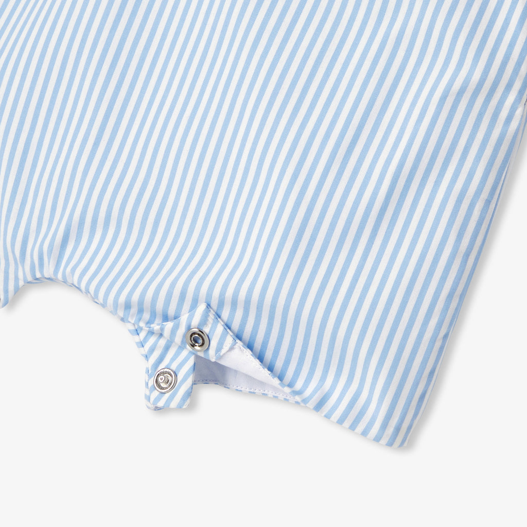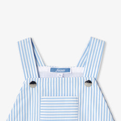 細かなブルーストライプ柄が上品な、柔らかいコットンポプリンのショート丈サロペットです。