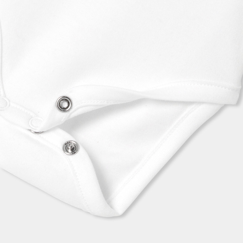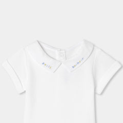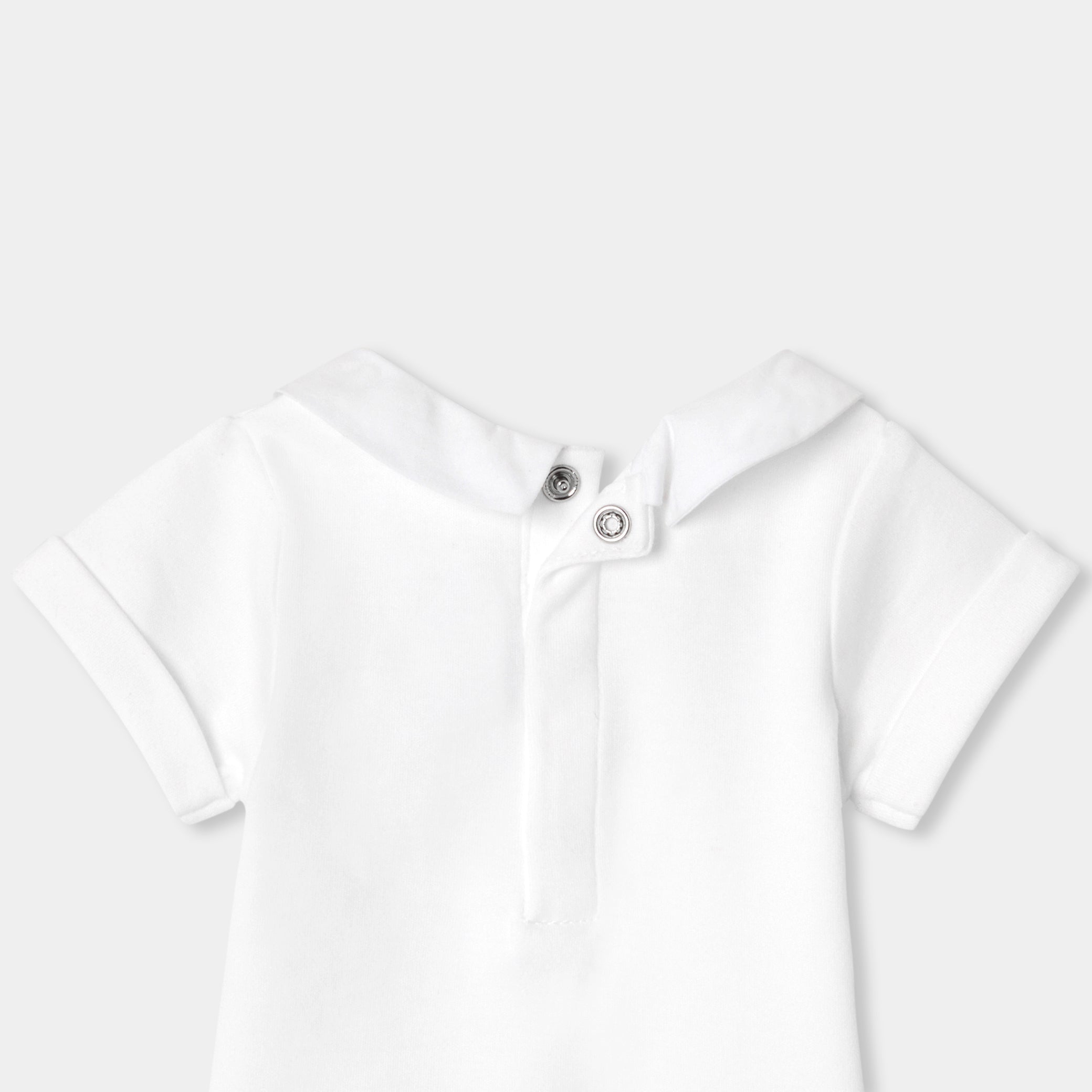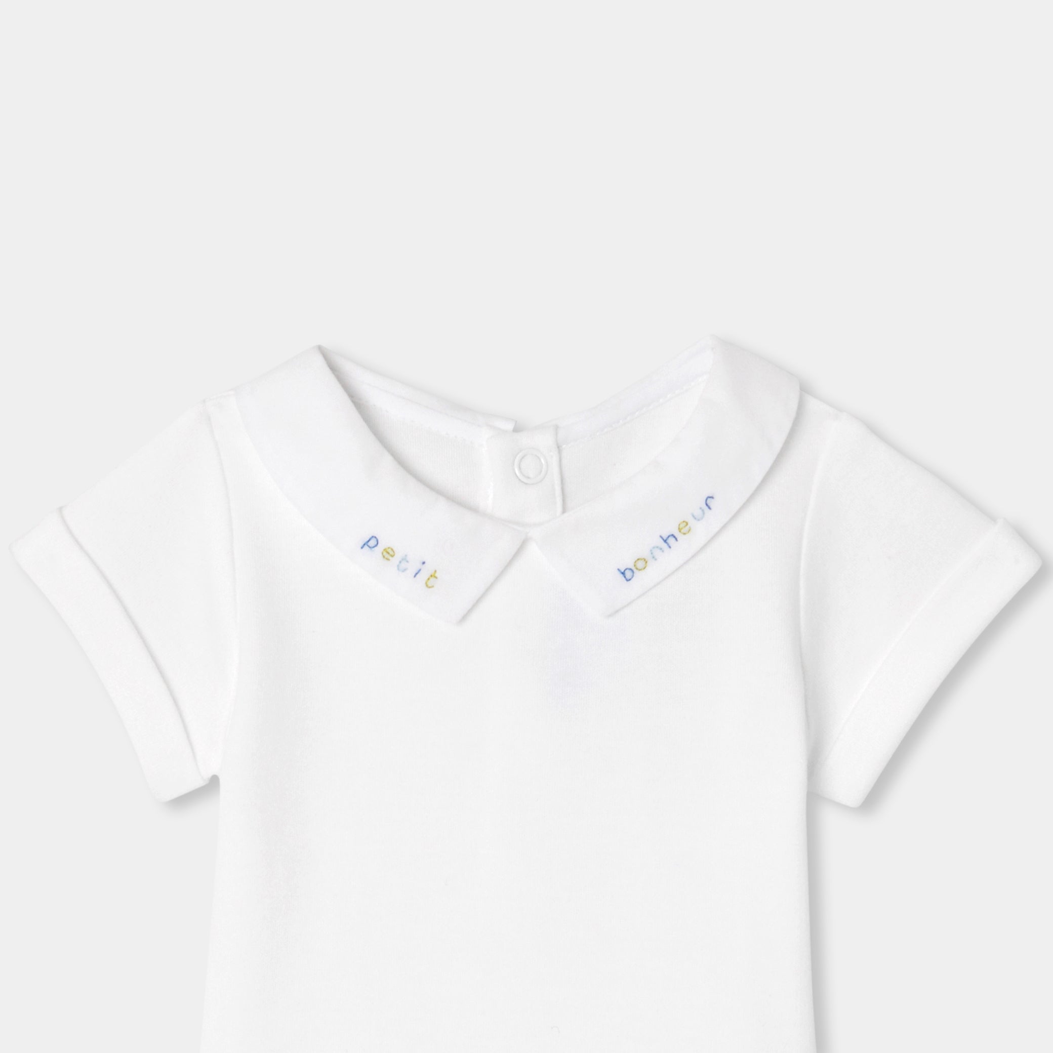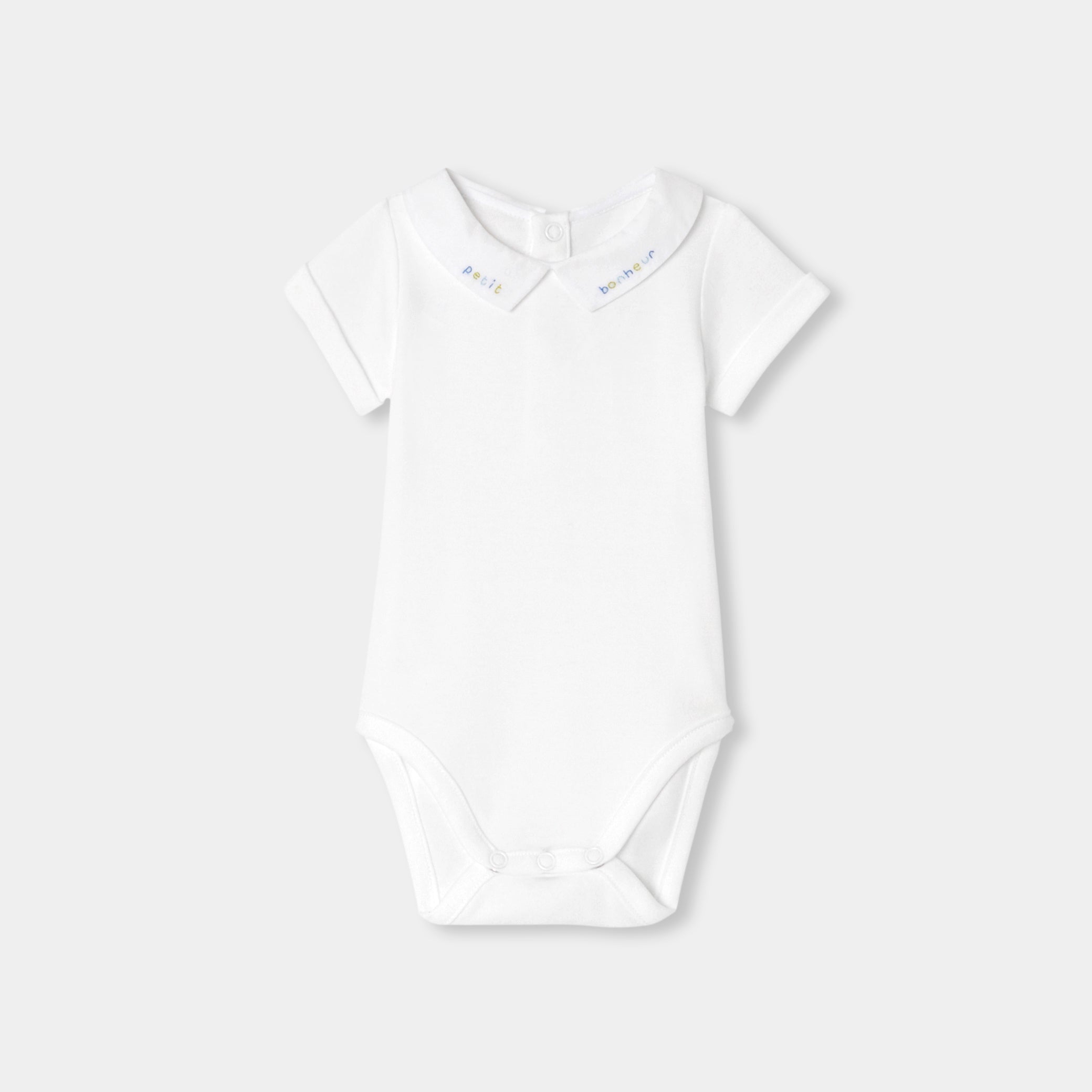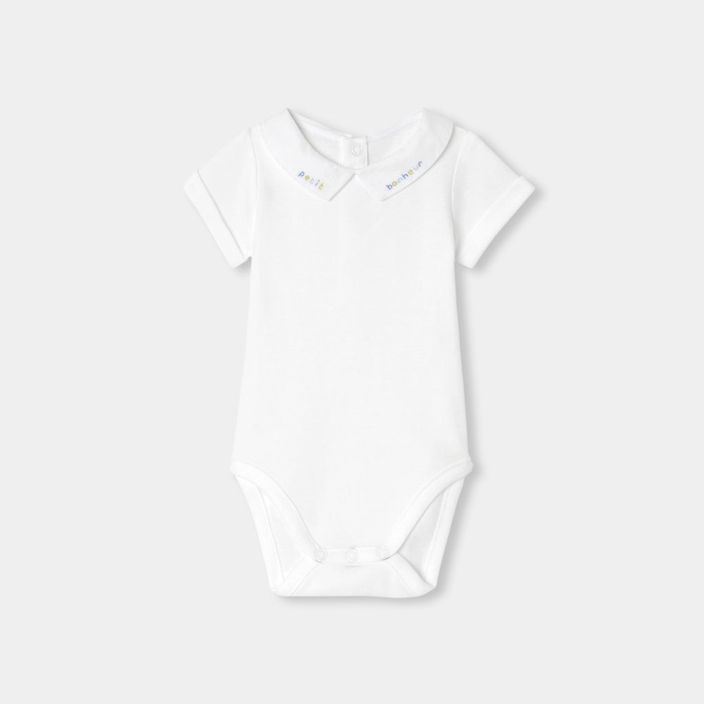 着心地が良くエレガントな、夏仕様のコットンボディスーツです。半袖デザインに、手刺しゅうで "petit bonheur(小さな幸せ)" の文字をあしらったポプリン襟がさりげないアクセントを添えます。