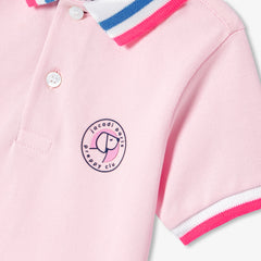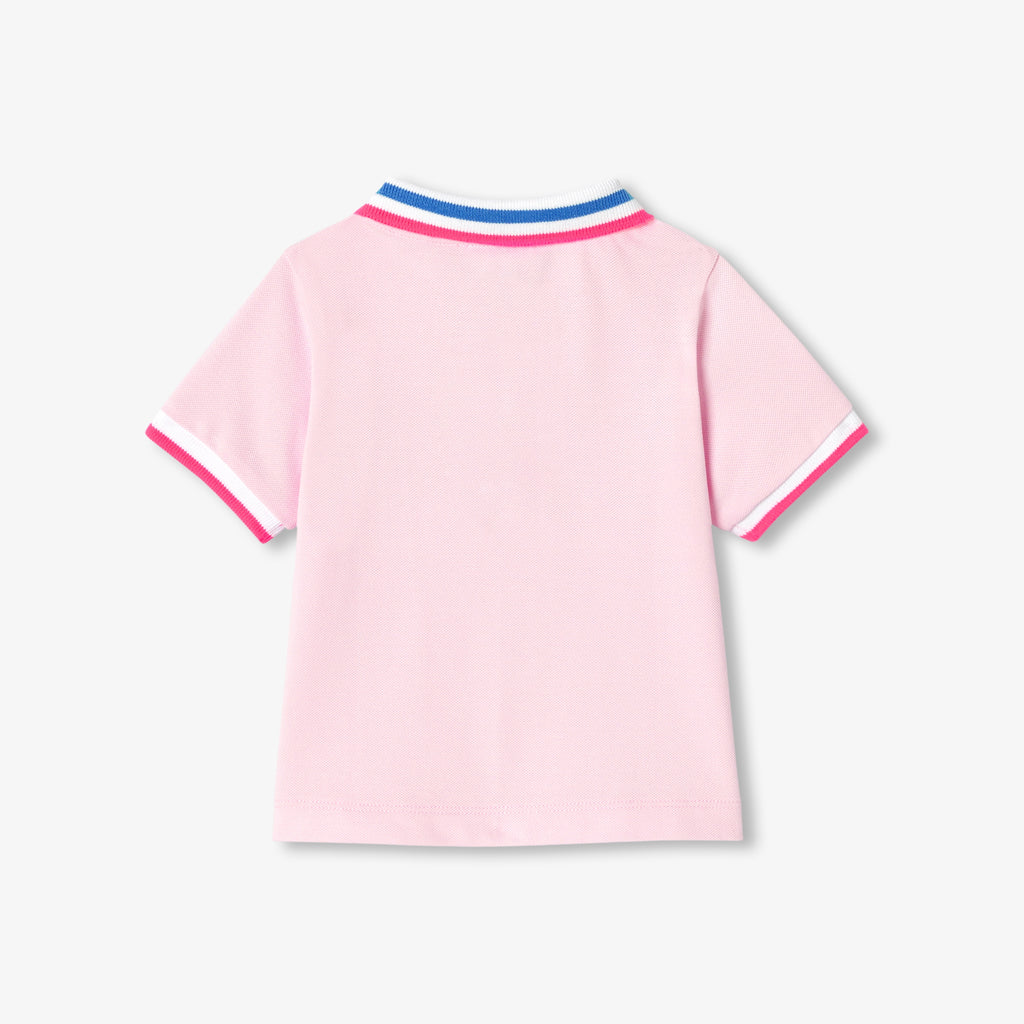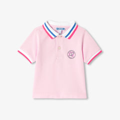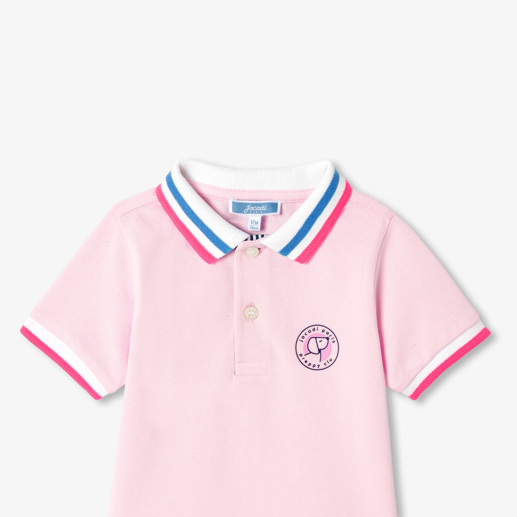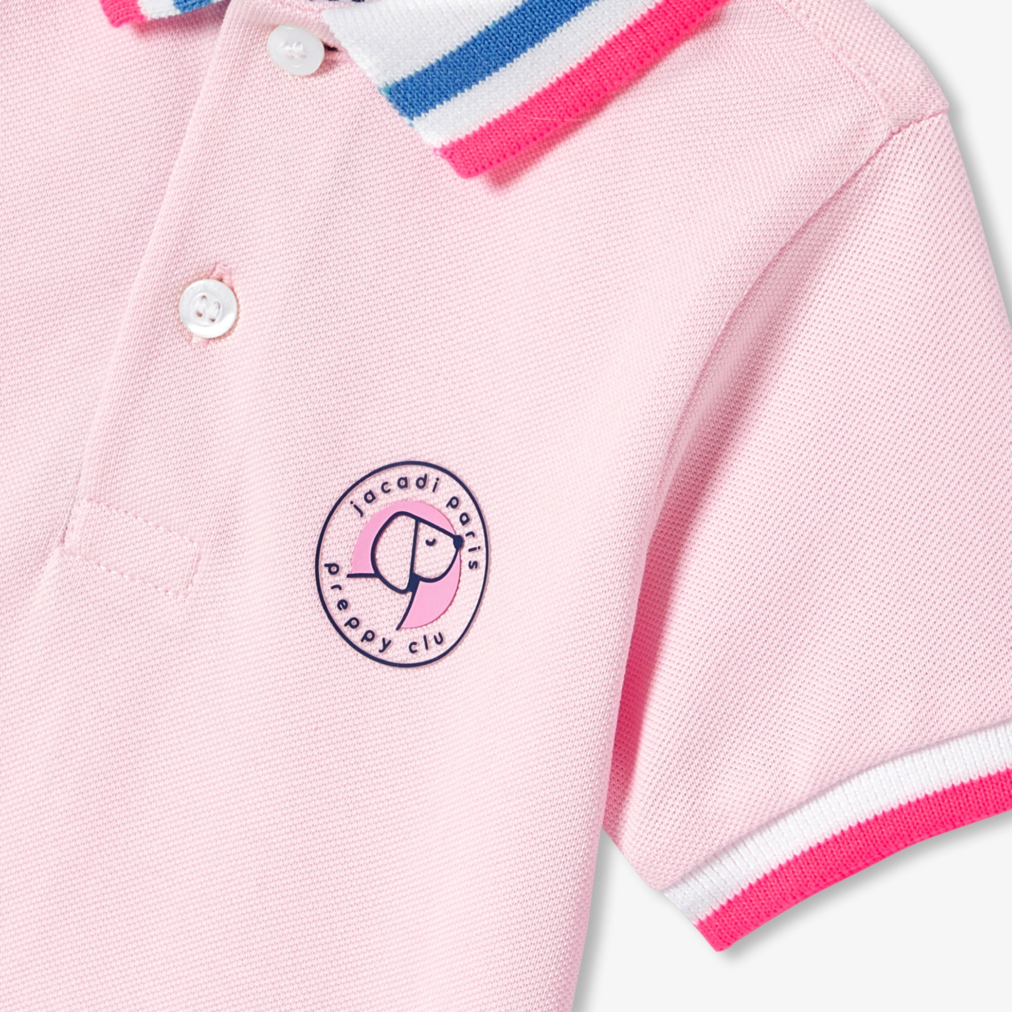 ジャカディ定番のポロシャツが、プレッピーでシック、モダンなデザインで登場。ストライプ柄の襟と、胸元にあしらった犬の顔のバッジ風プリントがポイント。カレッジスタイル風のデザインは、小さな犬の刺しゅう入りツイルショートパンツともよく合います。