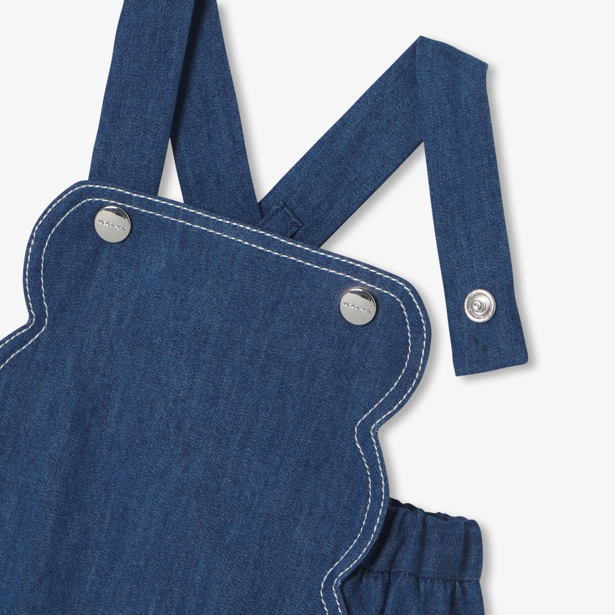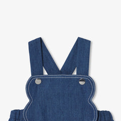 軽やかでしなやかなデニム素材を使用した、夏らしい印象のロンパースです。スカラップの胸当てにコントラストの効いたコバステッチを施し、背面のギャザーで程よいボリューム感をプラス。