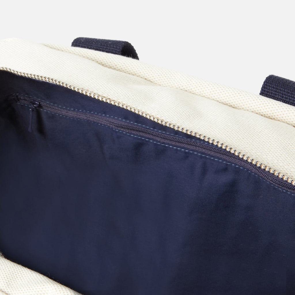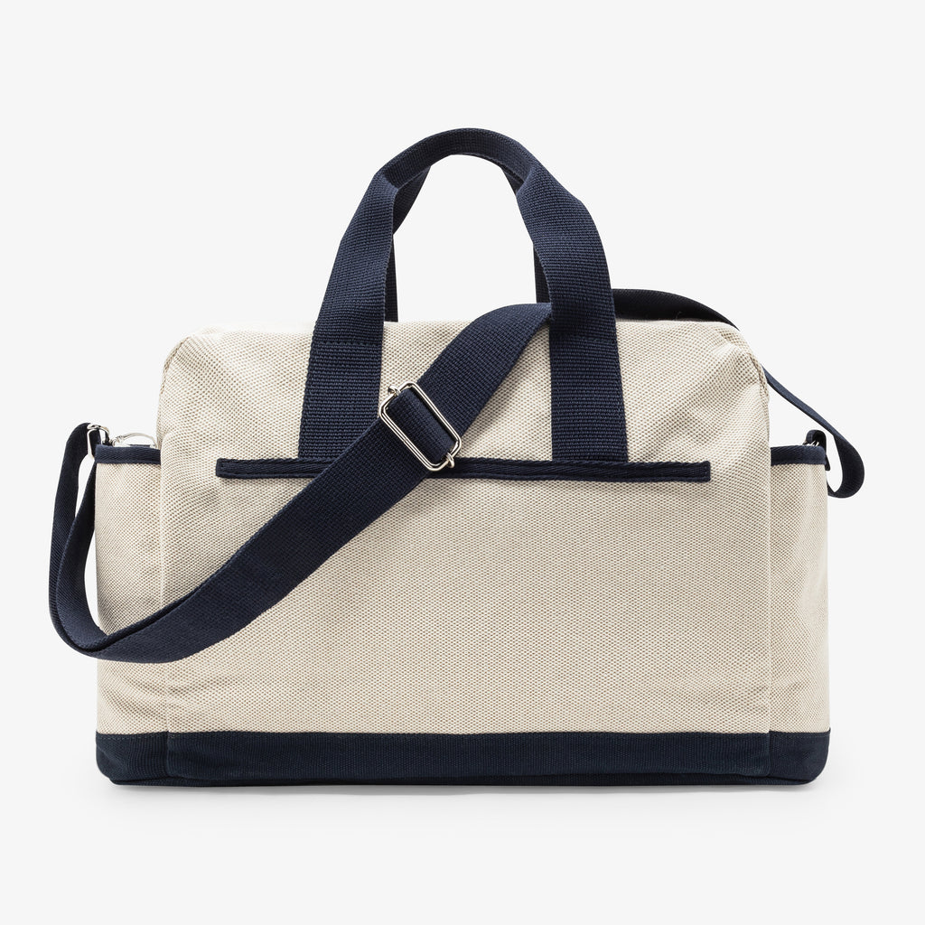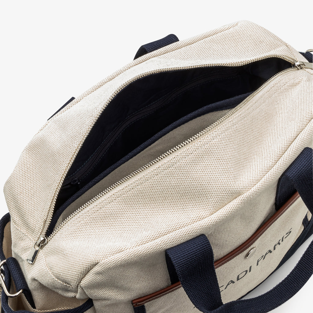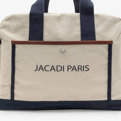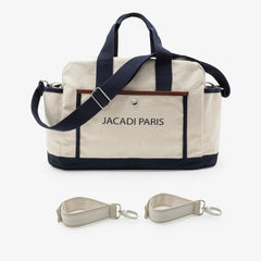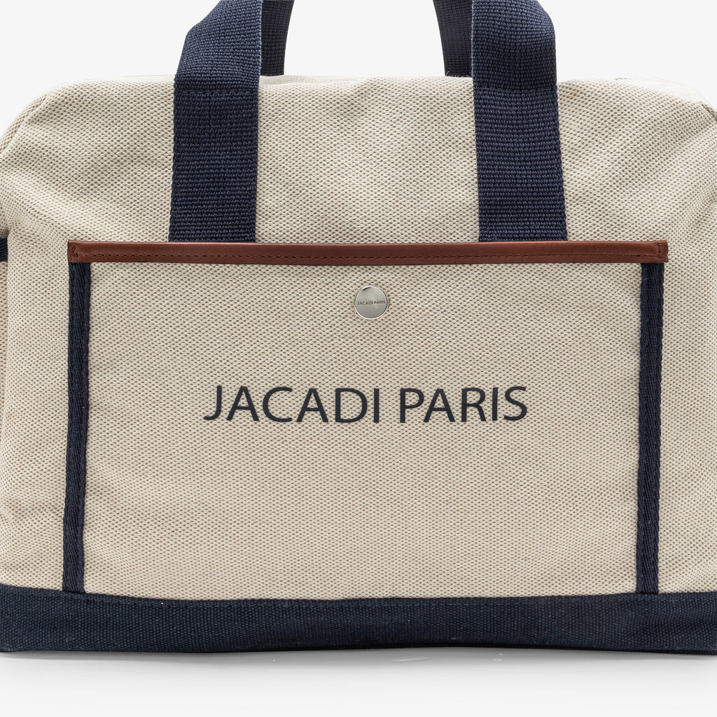 ベージュとネイビーの撥水コットンキャンバス地に、コニャックカラーのレザーディテールと「Jacadi Paris」のシルクスクリーンプリントを施し、控えめながらもエレガントなラインに仕上げました。