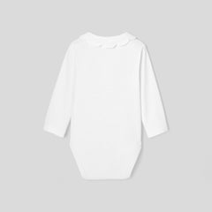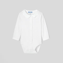 日常着にぴったりなオーガニックコットン使用の長袖ボディスーツ。スカラップのポプリン襟がエレガントな印象に。正面と股下のスナップボタン開閉で着脱も簡単。カーディガンや足つきレギンスと合わせて家族でのお出掛けを楽しんで。