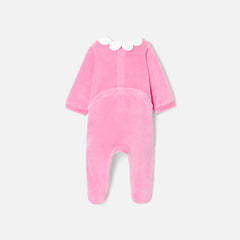 アイコニックなペタルカラーで襟元を彩った、シンプルで美しい足つきロンパース・パジャマ。柔らかでしなやかなベロア調生地を使用しており、背面の目立ちにくいスナップボタンでボディスーツの上からも簡単に着脱できます。赤ちゃんにぴったりのアイテムで、ご出産後からすぐにお使いいただけます。