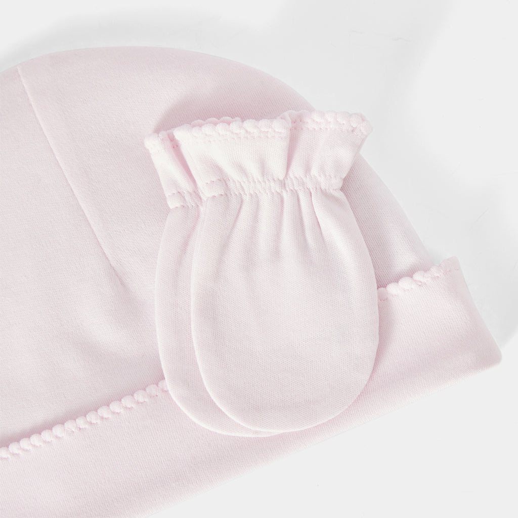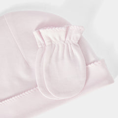 オーガニックコットンの柔らかな肌触りが特徴的な、帽子とお揃いのミトン手袋のセット。赤ちゃんの肌を引っかきから守るマストアイテムで、ご出産後からすぐにお使いいただけます。ご自宅用にもギフトにもおすすめです。