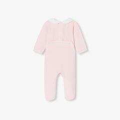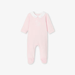 ご出産後からすぐにお使いいただける、シックなデザインの足つきロンパース・パジャマ。ベロア調生地を使用しており、刺しゅうをあしらったポプリンのピーターパンカラー(襟)が目を惹きます。赤ちゃんのナイトタイムに優しく寄り添う必需品で、ジャカディのスリーパーと組み合わせるのがおすすめ。