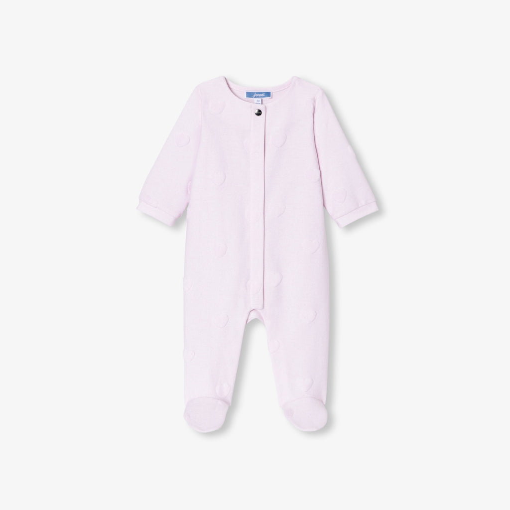 柔らかなジャージー素材の快適な着心地とモダンな雰囲気を兼ね備えた足つきロンパース・パジャマ。ジャカディの技術が詰まった一着です。ジャガード織のハートモチーフが可愛らしく、前開きのデザインで着脱も安心・簡単。ご出産後からすぐにお使いいただけ、ご自宅用にもギフトにもおすすめです。
