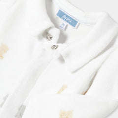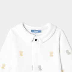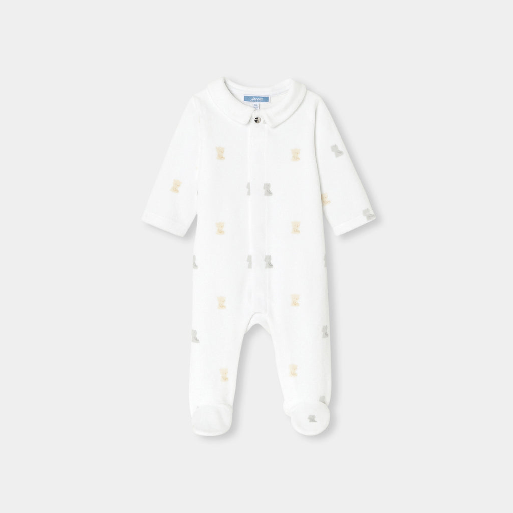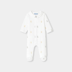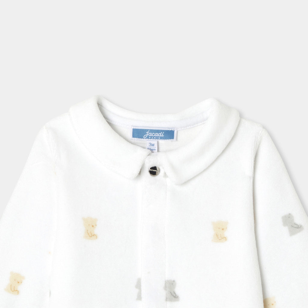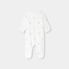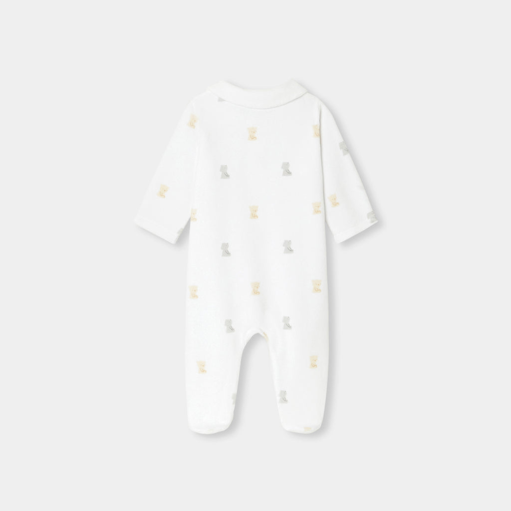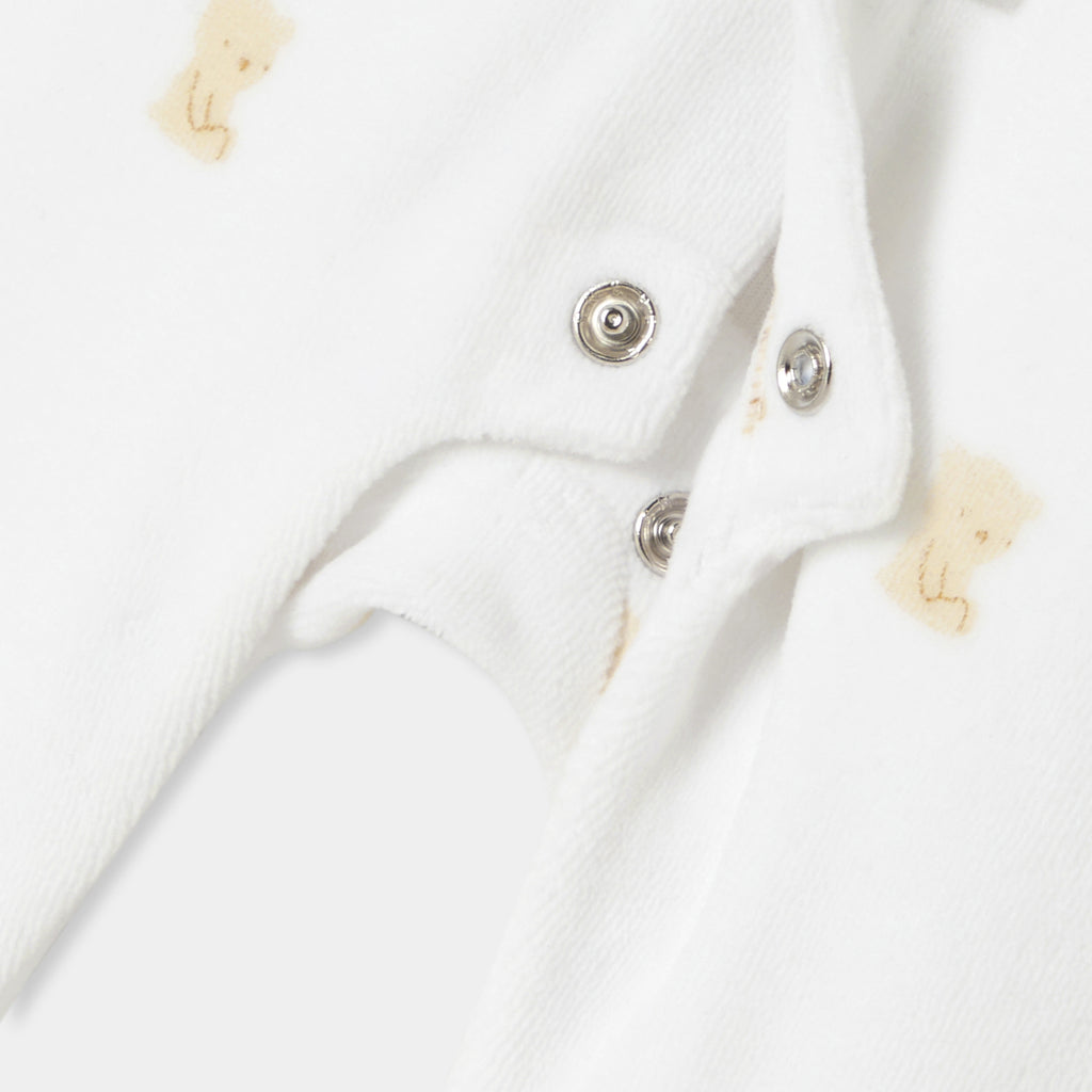 柔らかな色合いの生地に小さなテディベアと可愛らしいモチーフをあしらった、必需品の足つきロンパース・パジャマ。柔らかなベロア調生地を使用した着心地の良いモデルが、赤ちゃんの安らかな眠りを約束してくれます。アイコニックなポプリン襟がアクセントになっており、目立ちにくいスナップボタンで、着脱も安心・簡単。ご自宅用にもギフトにもおすすめです。初めてのワードローブに選んでみて。