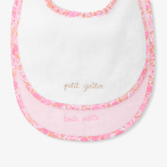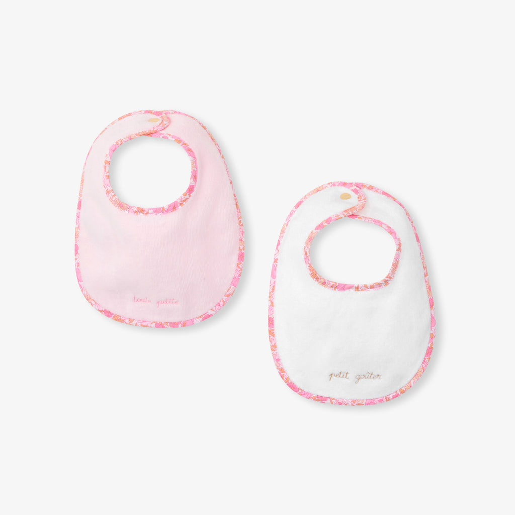 赤ちゃんのタオル地のスタイがさらに上品になりました。リバティプリントのバイアステープと刺しゅうされたメッセージがアクセントになっていて、スナップボタン留めで付け外しも簡単です。赤ちゃんのジャカディデビューにぴったりです。