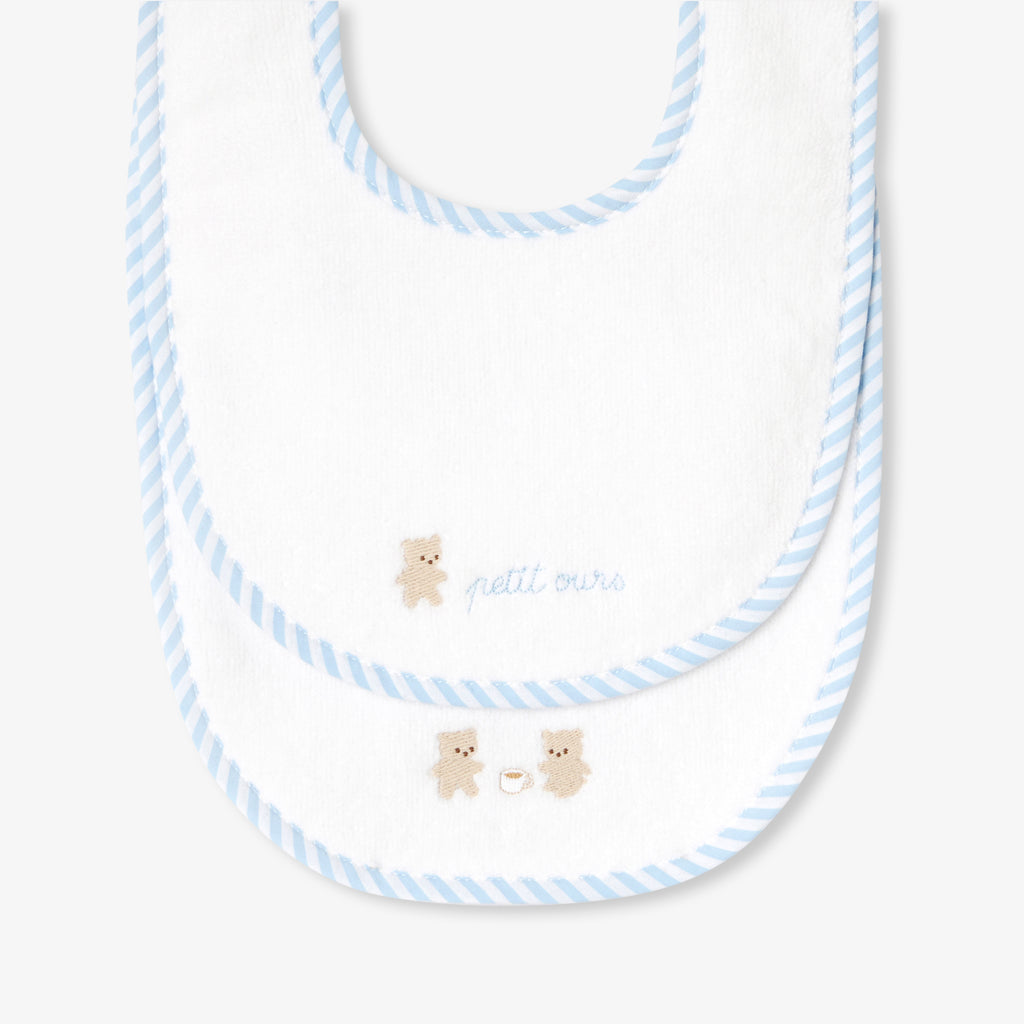 柔らかいタオル地のスタイ2枚セット。ストライプポプリン生地の縁取りで、1枚にはおやつを楽しむ可愛いクマたちのイラストが、もう1枚にはクマと小さなメッセージが刺しゅうされています。スナップボタンで簡単に留められるので、ご自宅用にも出産祝いにもおすすめです。