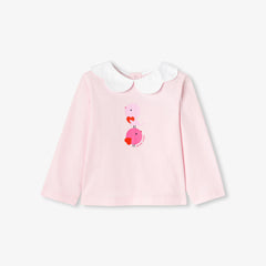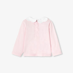 毎日を明るくエレガントに彩る、オーガニックコットンジャージーTシャツ。スカラップ襟に施した遊び心のあるモチーフは、小さなお子さまを喜ばせること間違いなし。背面開きで、着脱も簡単なマストアイテムです。ベロア調生地のショートパンツとカラフルなカーディガンを合わせて。