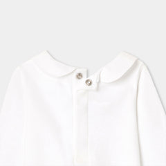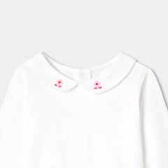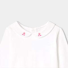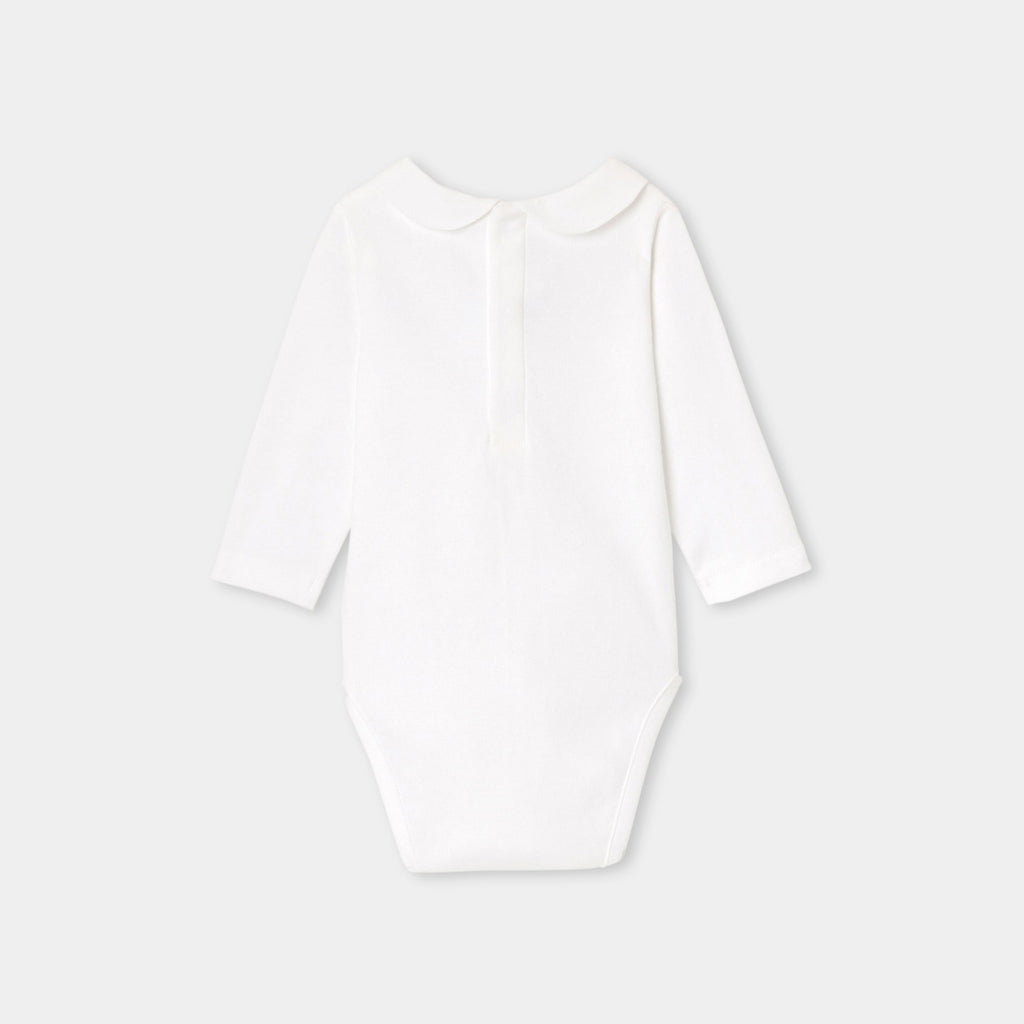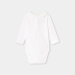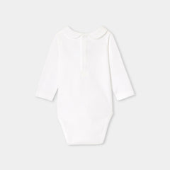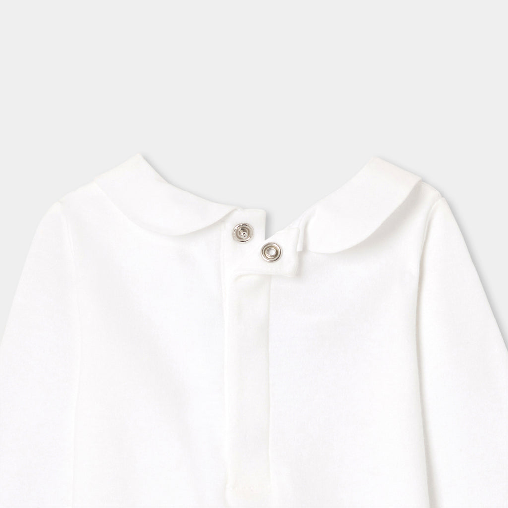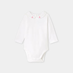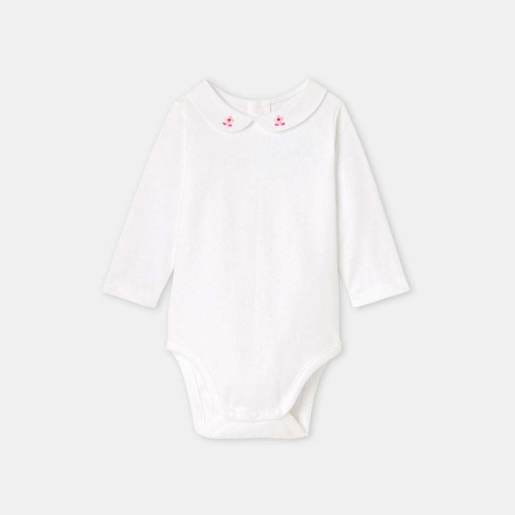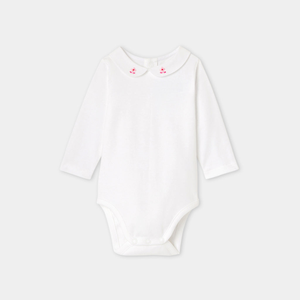 毎日のワードローブに欠かせない、柔らかでしなやかなインターロックコットン製のボディスーツ。フラワーの手刺しゅうを施したピーターパンカラー(襟)がシックな雰囲気に。ワンピースやロンパースと合わせやすい万能モデルです。