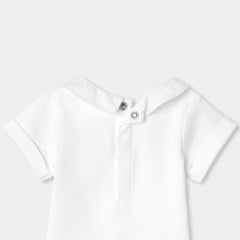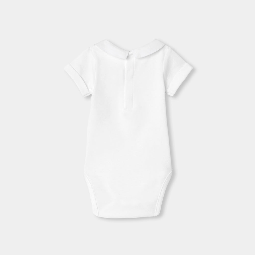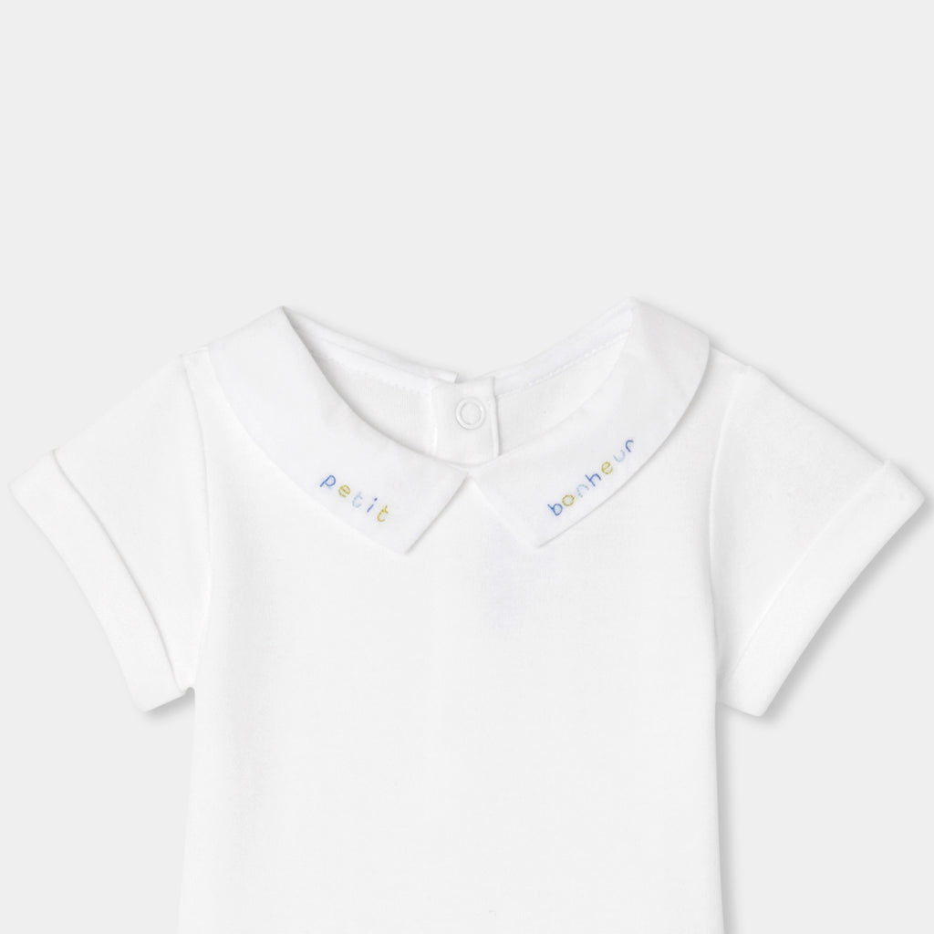 着心地が良くエレガントな、夏仕様のコットンボディスーツです。半袖デザインに、手刺しゅうで "petit bonheur(小さな幸せ)" の文字をあしらったポプリン襟がさりげないアクセントを添えます。