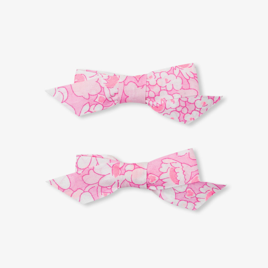 リバティプリント(花柄)のリボンをあしらったヘアクリップ。細い髪にも使いやすく、春夏のヘアスタイルにロマンチックなアクセントを添えます。