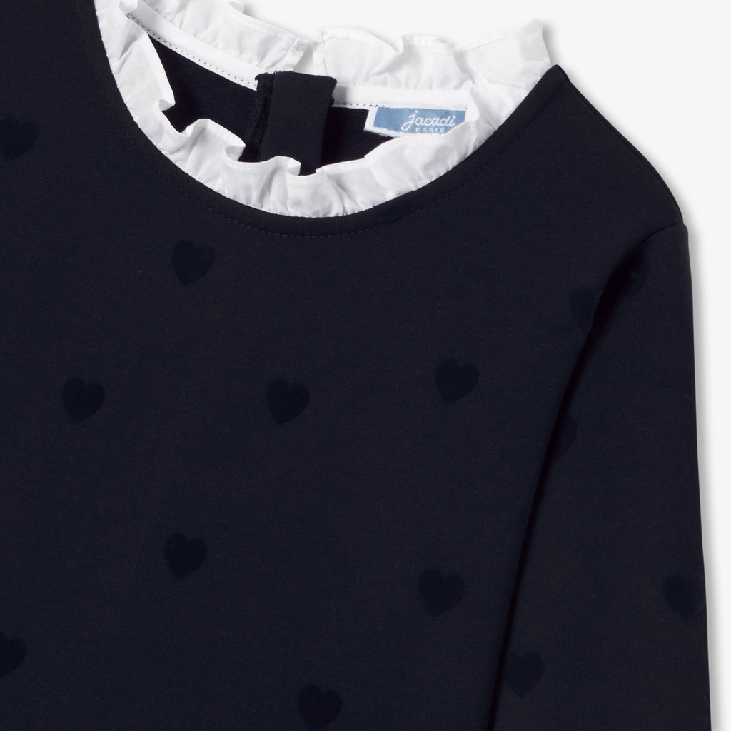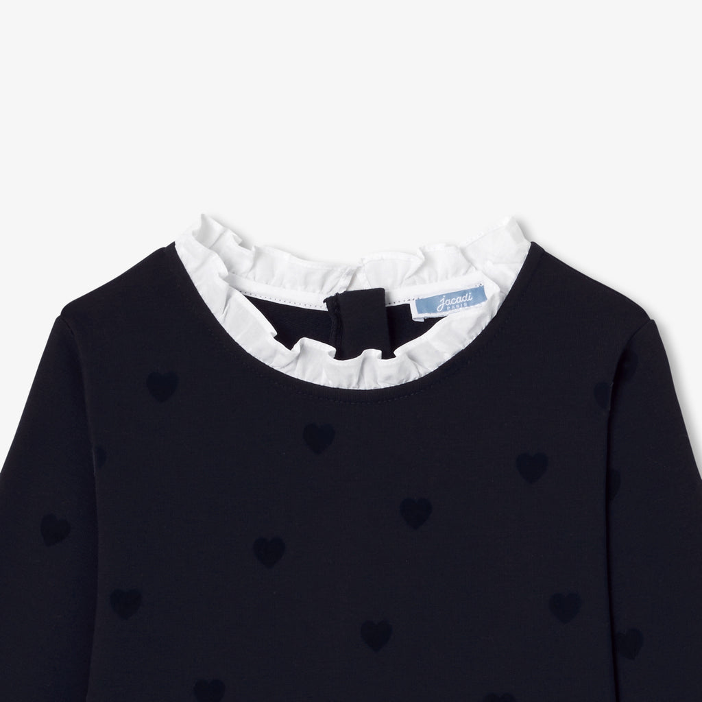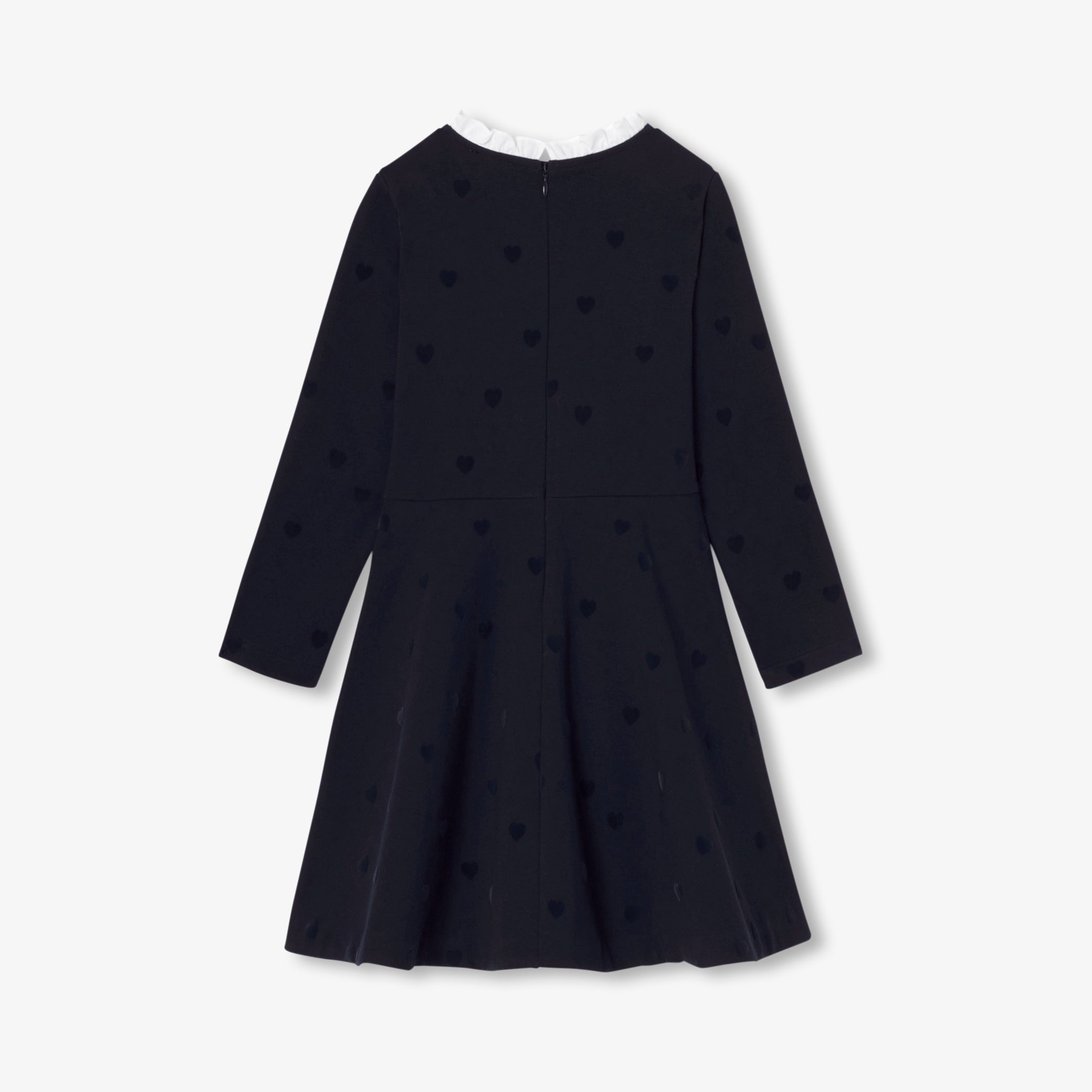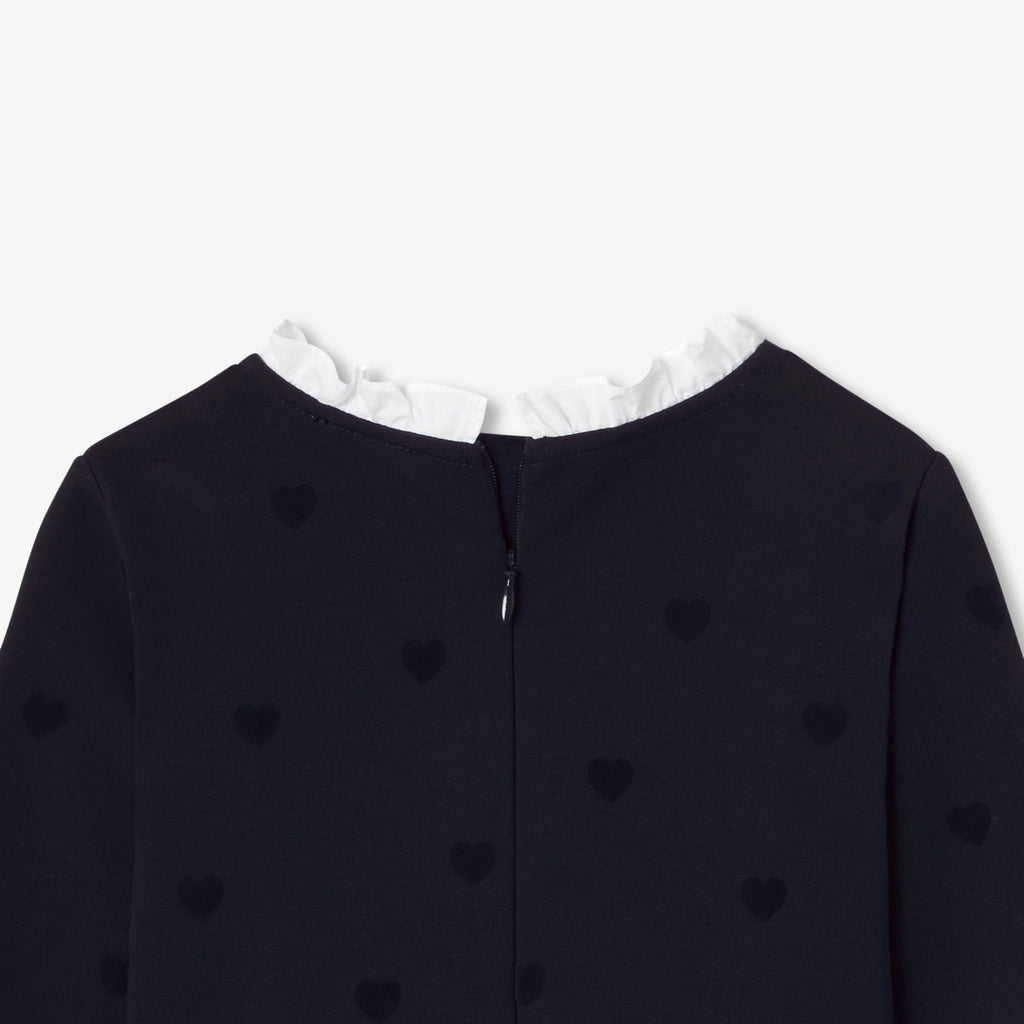 レトロシックなワンピース。モダンなフリースにフロッキー加工で同系色の小さなハートをちりばめました。ポプリンのフリル襟とウエストのカットアウトが施された、可愛らしく快適なデザインです。お気に入りのシューズと合わせて新学期に着たくなる一着です。