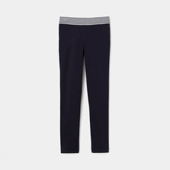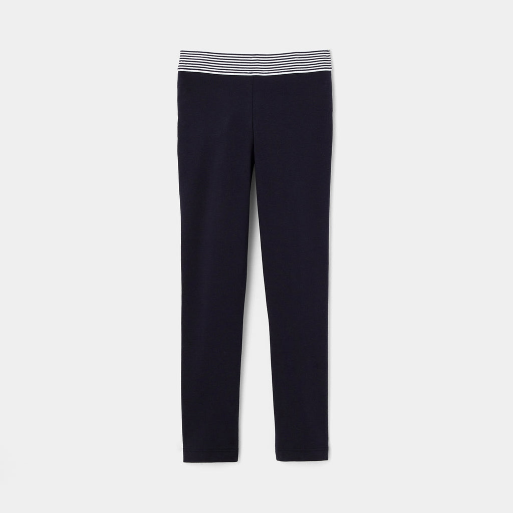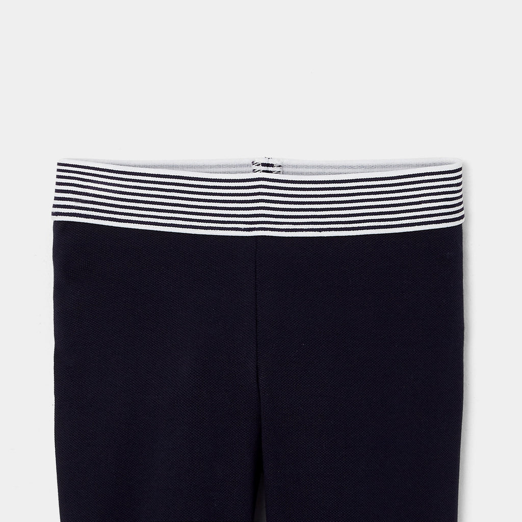 新学期のスタートにもぴったりなスタイリッシュなレギンスパンツ。柔らかで着心地のよいコットンピケを使用し、ストライプ柄の伸縮性のあるウエストゴムがアクセントに。