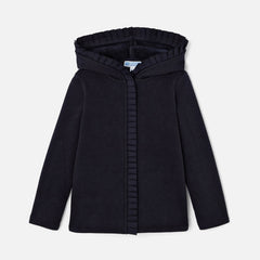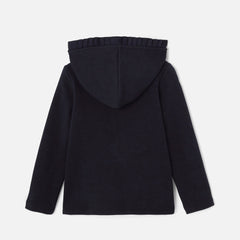 肌寒い時期のワードローブにぴったりなフード付きファスナースウェット(パーカー)。正面ファスナーとフードのフリル縁がスポーティーシックにエレガントをプラス。フレアジーンズやスニーカーと合わせて公園遊びに出掛けてみて。