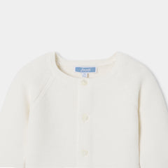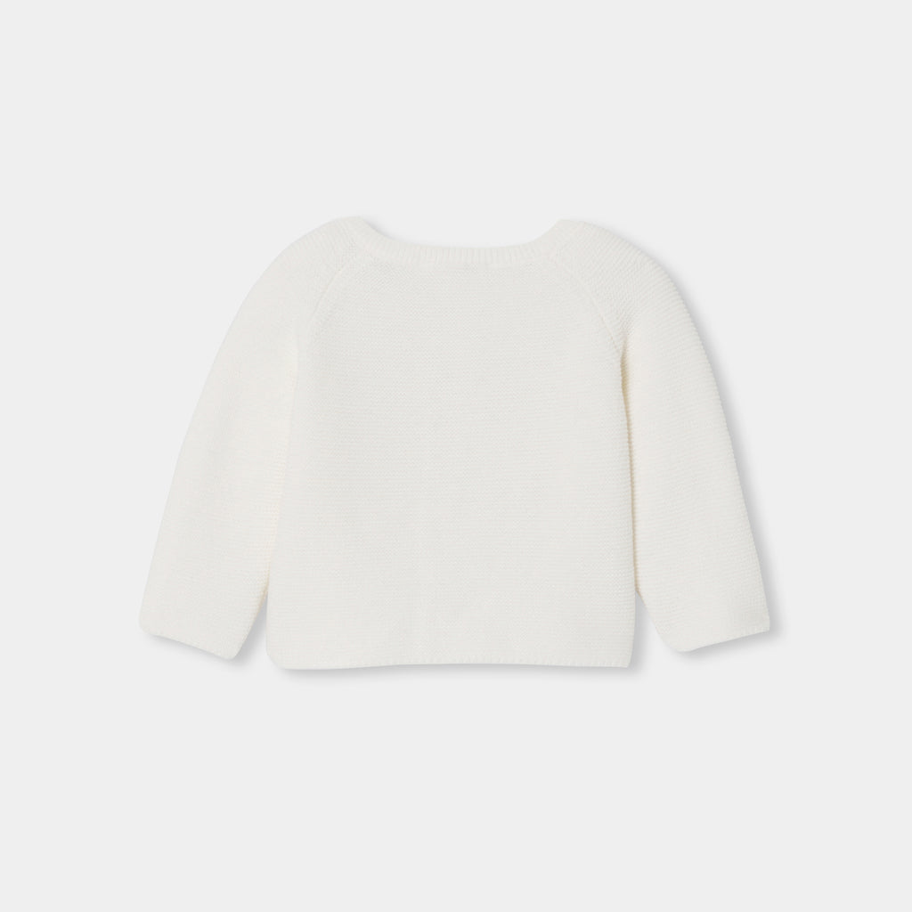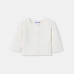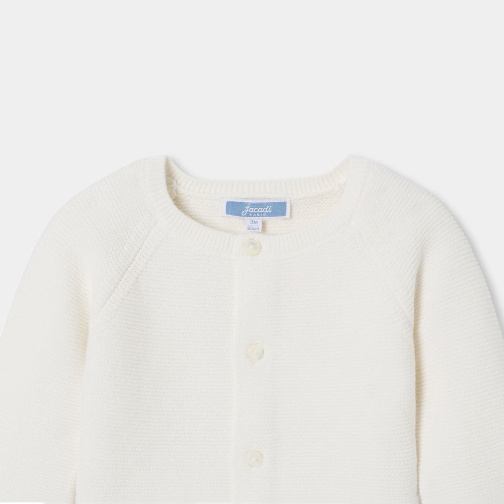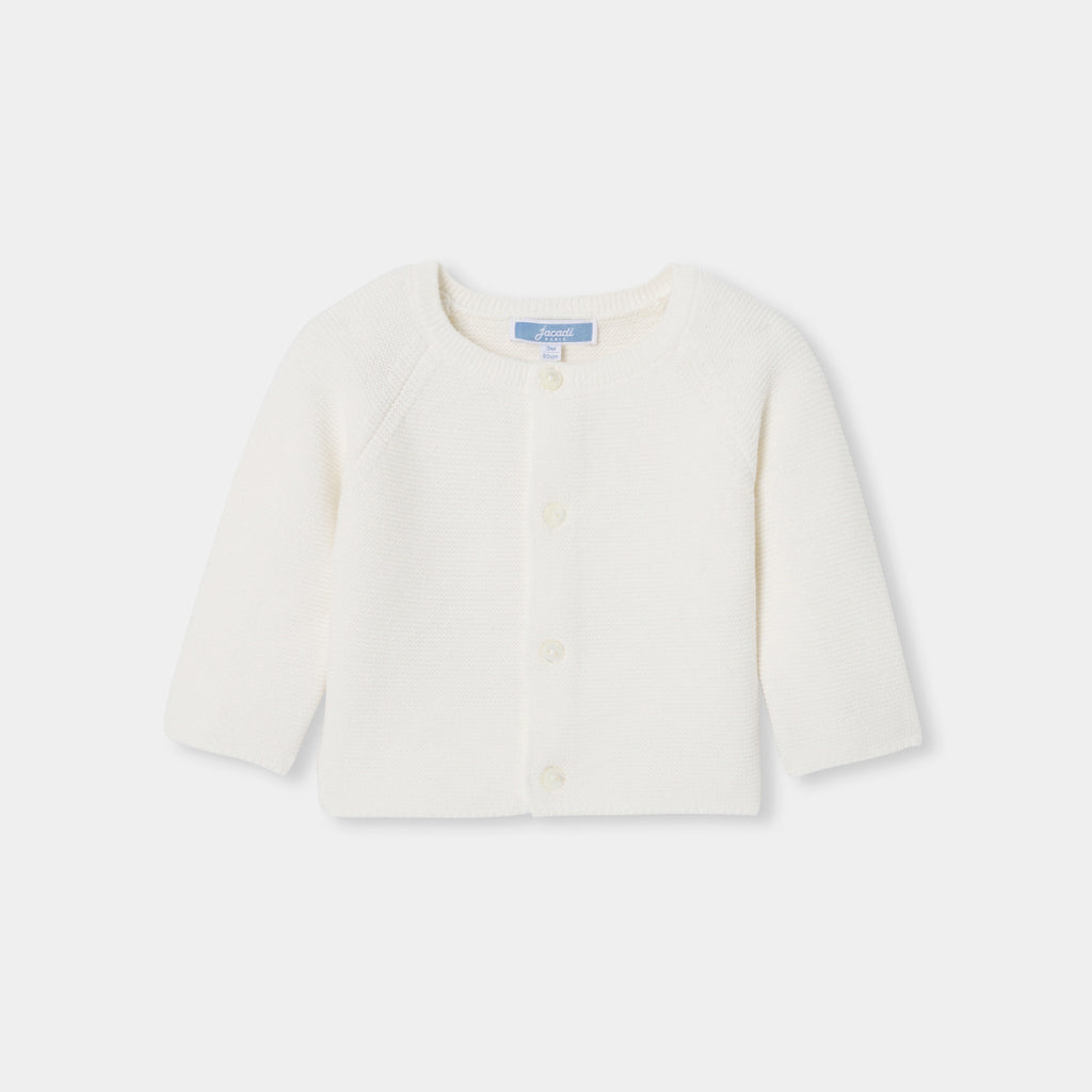 赤ちゃんに寄り添うガーター編みカーディガン。レスポンシブルウールとコットンを使用したワードローブの必需品で、赤ちゃんを心地良い暖かさで包み込みます。ボタンで開閉でき、着脱も簡単。足つきロンパース・パジャマやボディスーツを合わせて。