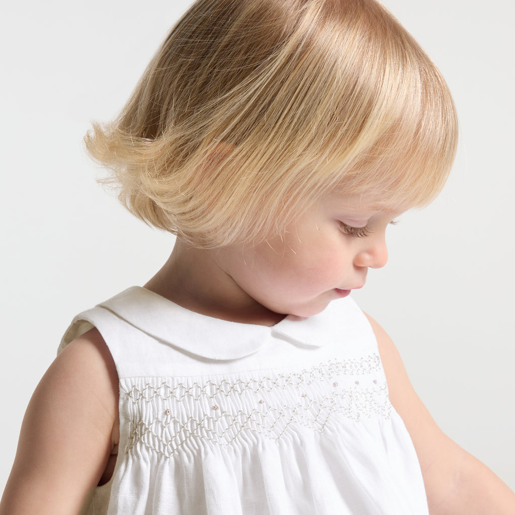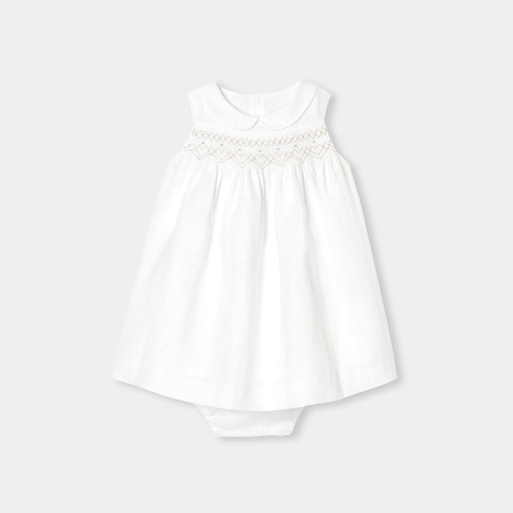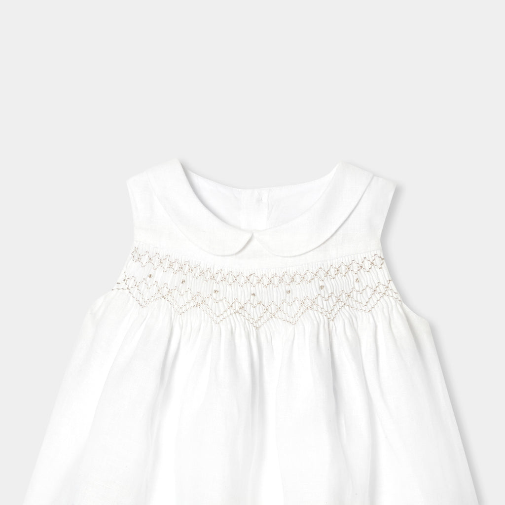 お祝いの場にふさわしい、シックで正統派なシルエットのリネンワンピース。美しい銀糸のスモック刺しゅうと切り替えのウエストが特徴的。伸縮性のあるウエストゴム入りのブルマ付きで、特別な日には帽子やサンダルを合わせて。