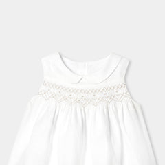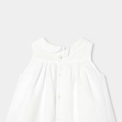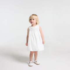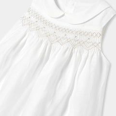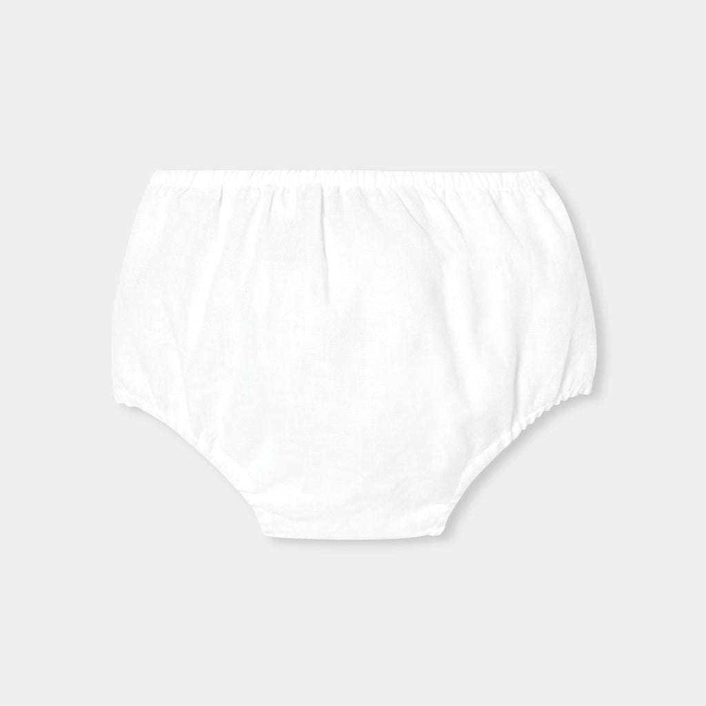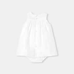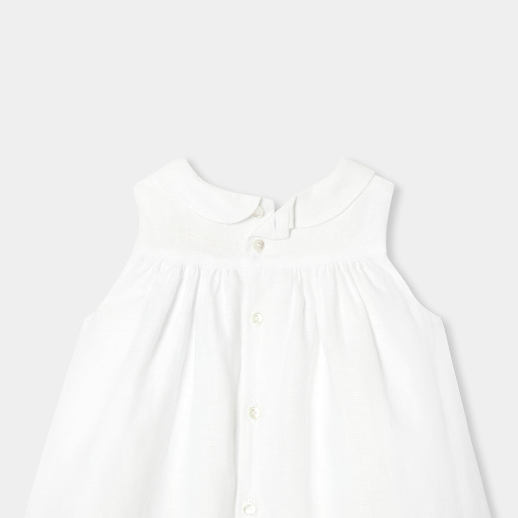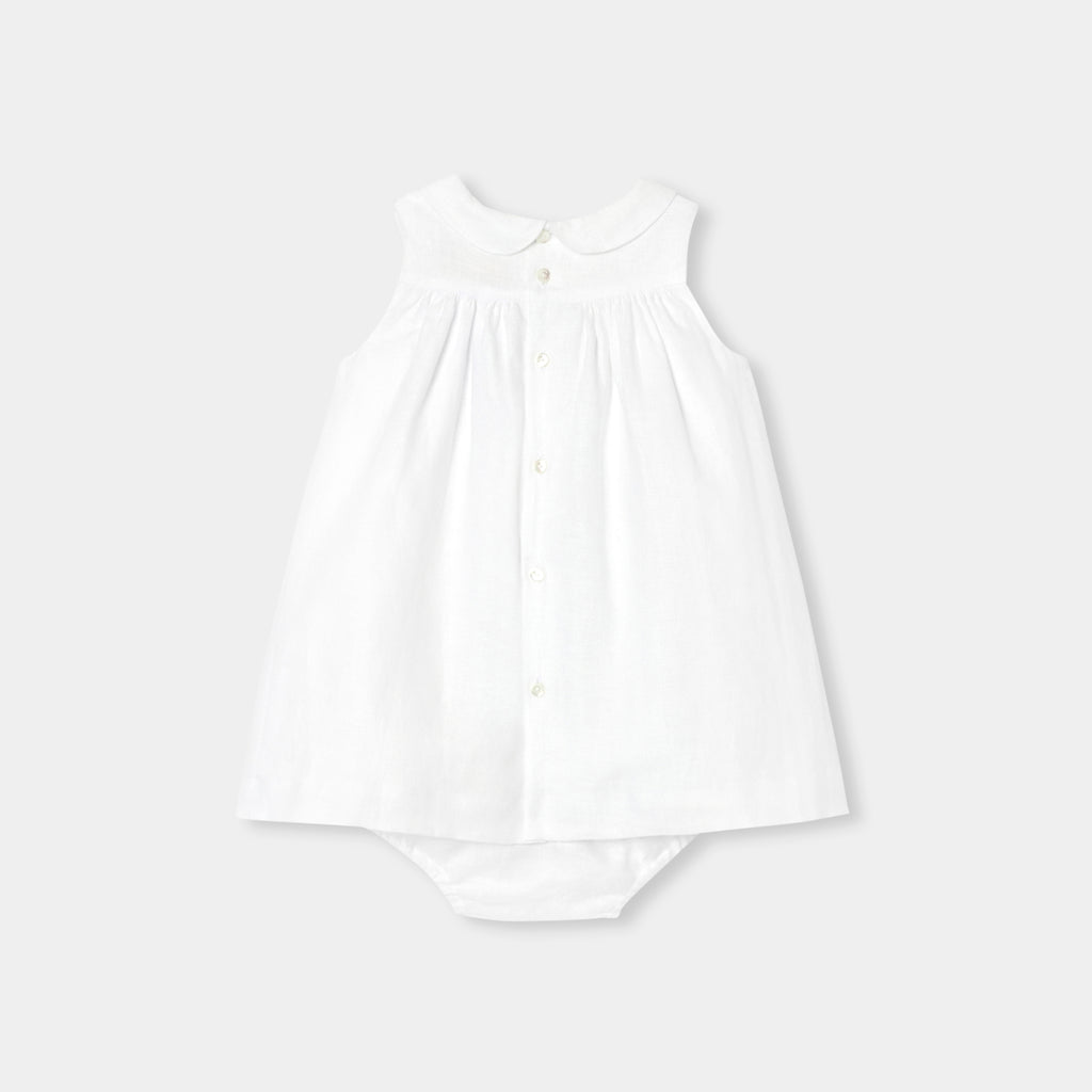 お祝いの場にふさわしい、シックで正統派なシルエットのリネンワンピース。美しい銀糸のスモック刺しゅうと切り替えのウエストが特徴的。伸縮性のあるウエストゴム入りのブルマ付きで、特別な日には帽子やサンダルを合わせて。