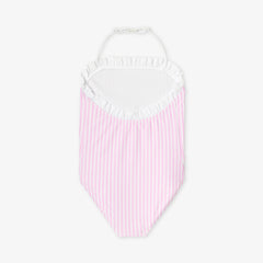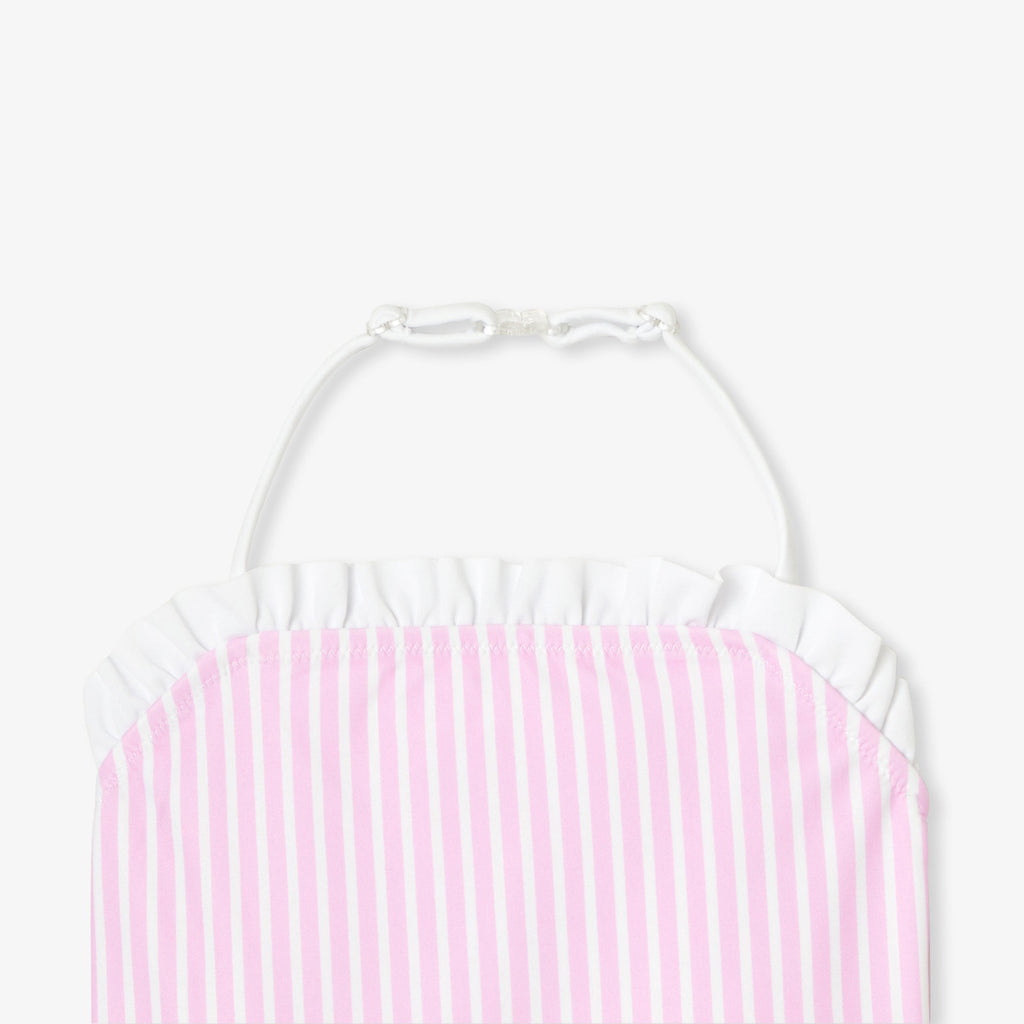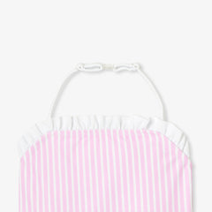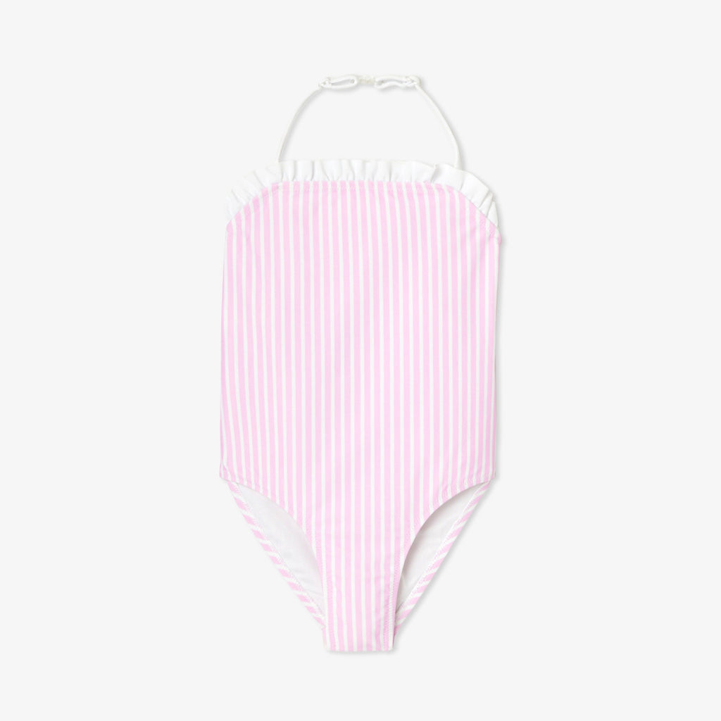夏の訪れとともに、エレガントなワンピース水着が登場。印象的で落ち着きのあるモデルで、細めのストライプとコントラストの効いたフリルがレトロシックな雰囲気を演出しています。ビーチやプールには、フレンチテリー織のショートパンツとトートバッグを合わせて。