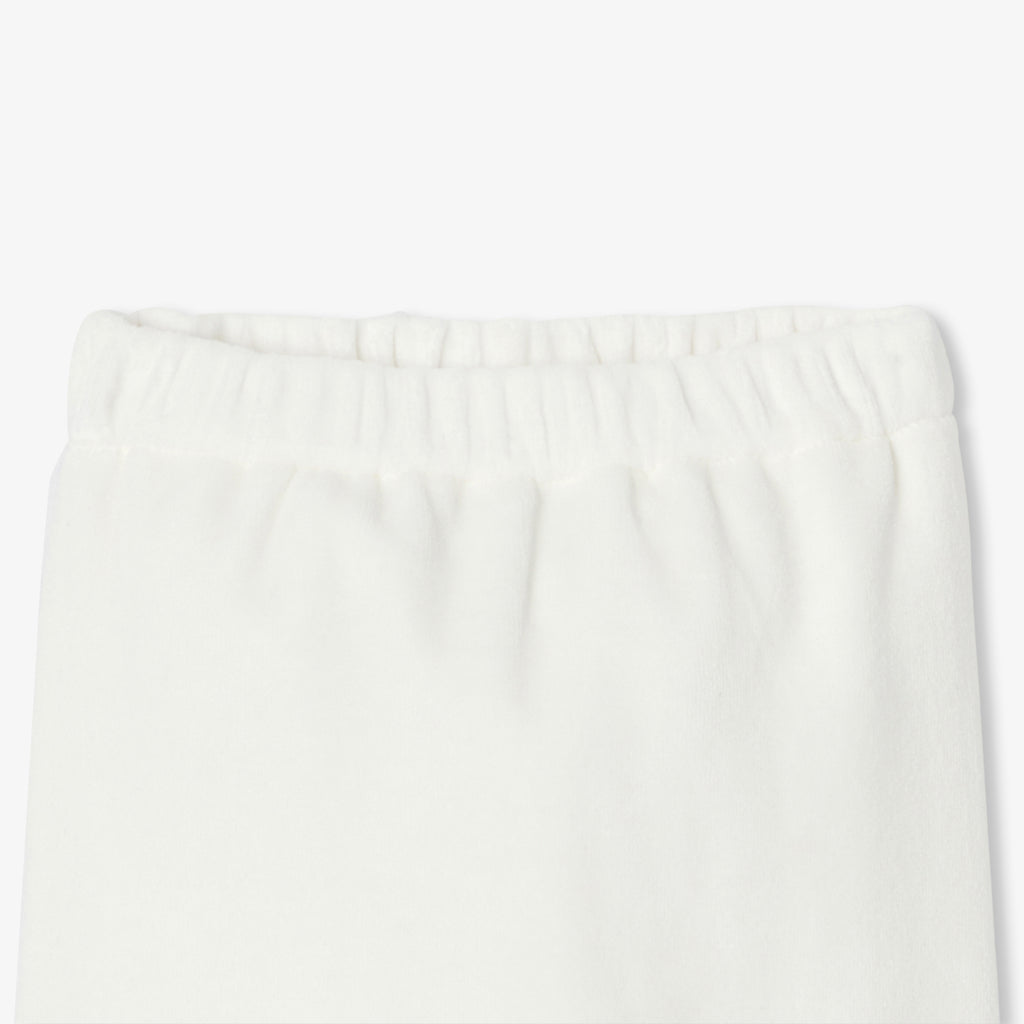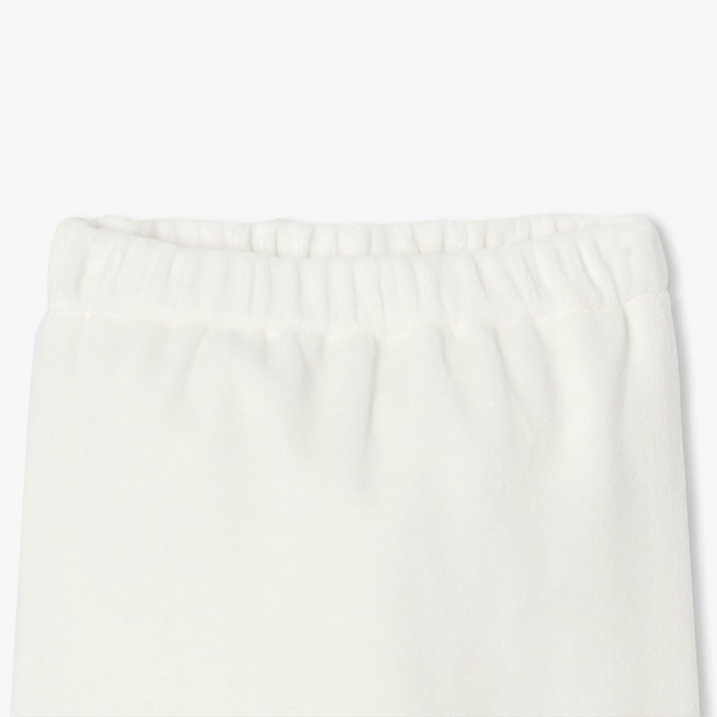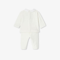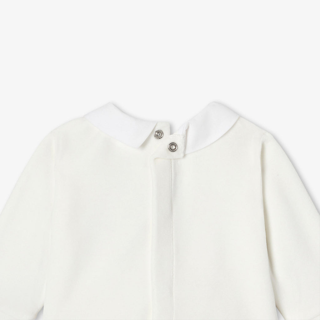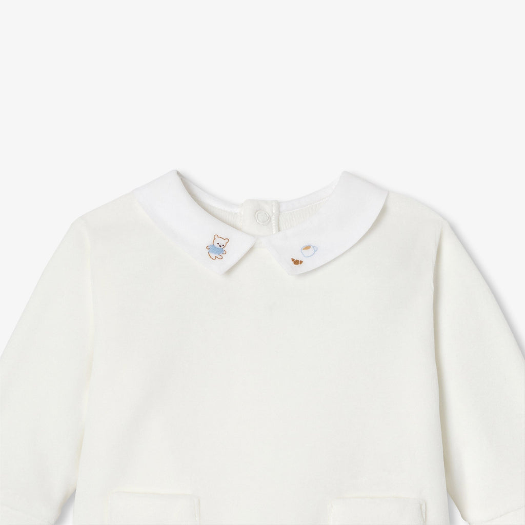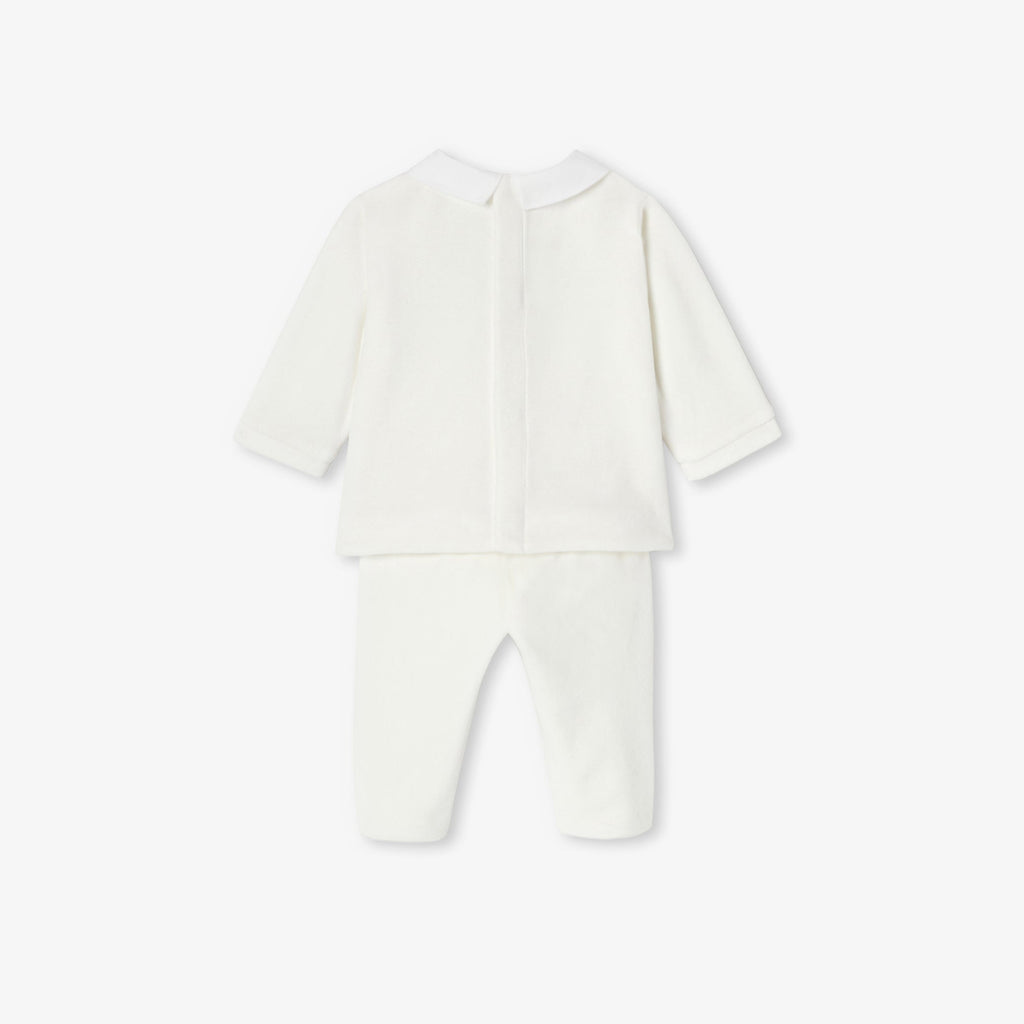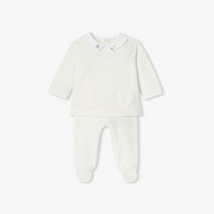 しなやかで着心地の良いベロア調生地を使用した、実用性の高いアンサンブル。背面のスナップボタンで開閉できるトップスと、伸縮性のあるウエストゴム入りの足つきパンツが上下セットになっています。可愛らしい手刺しゅうモチーフを施したポプリン襟とパッチポケットがアクセントに。ご家庭や通園で重宝する、秋にぴったりのアイテムです。