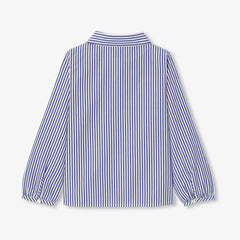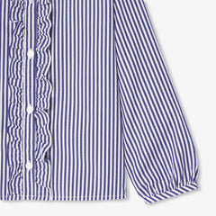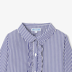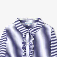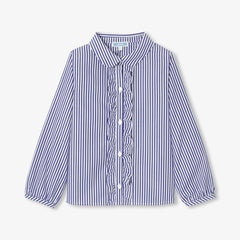 通園・通学にぴったりの、シックで幾何学的なデザインが魅力のシャツ。ストライプのポプリン製で、ボタン式プラケットにギャザーのフリルがあしらわれた、エレガントなモデルです。ワイドジーンズやキュロットスカートに合わせれば、プレッピーなシルエットに。