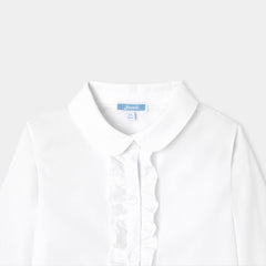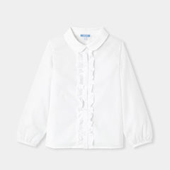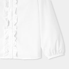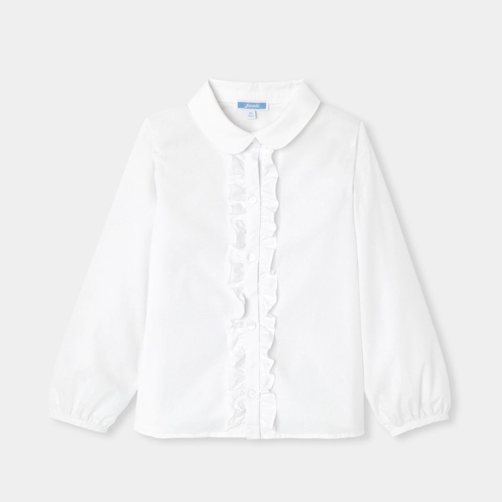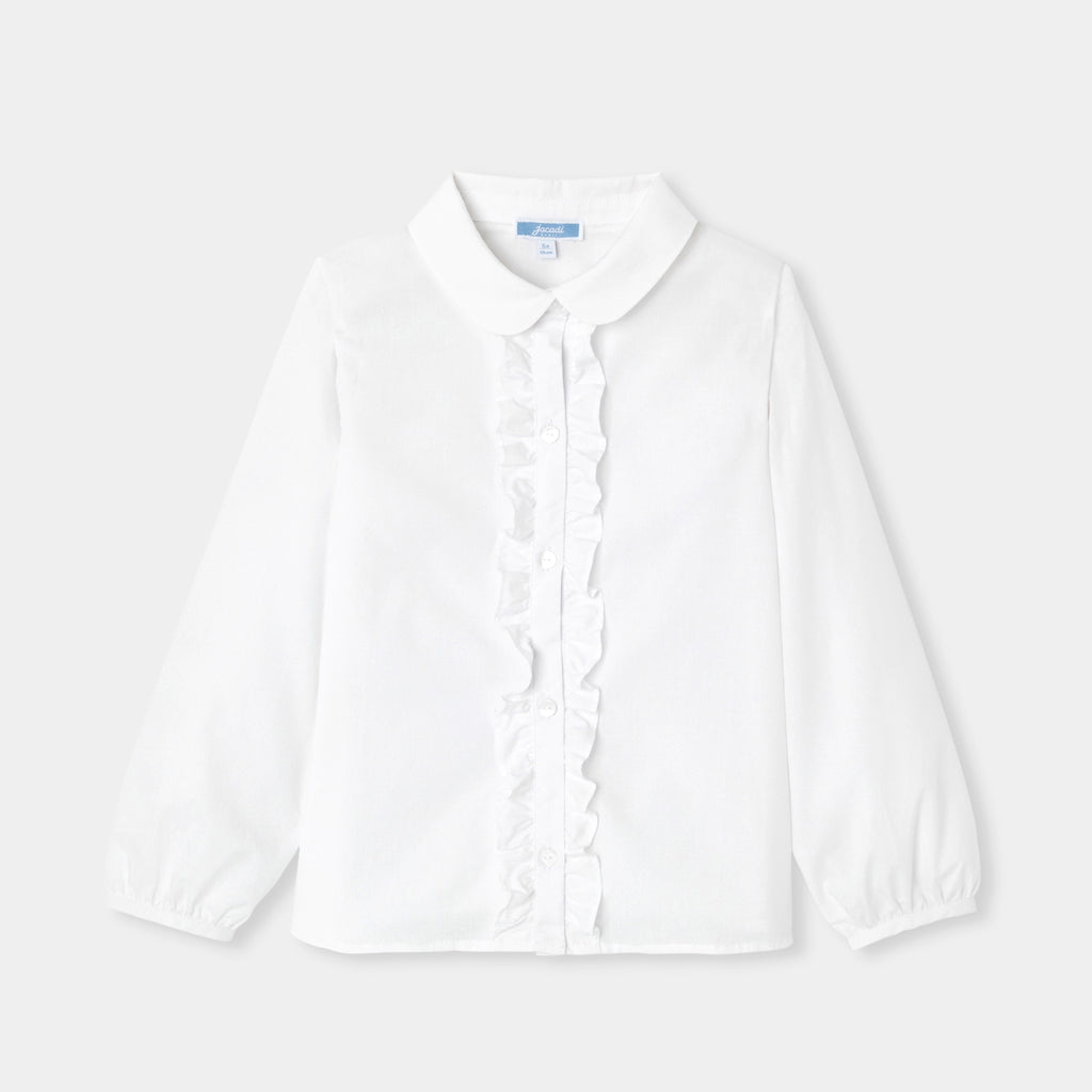 フリルのついたボタン式プラケットが魅力の、無地のコットンポプリン製シャツ。新学期らしいシックな雰囲気を演出するデイリーアイテムです。プリーツスカートやワイドパンツと合わせて、プレッピーに。