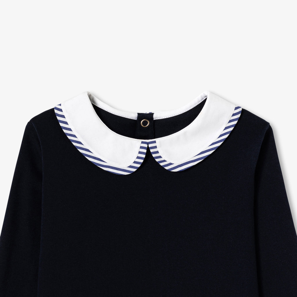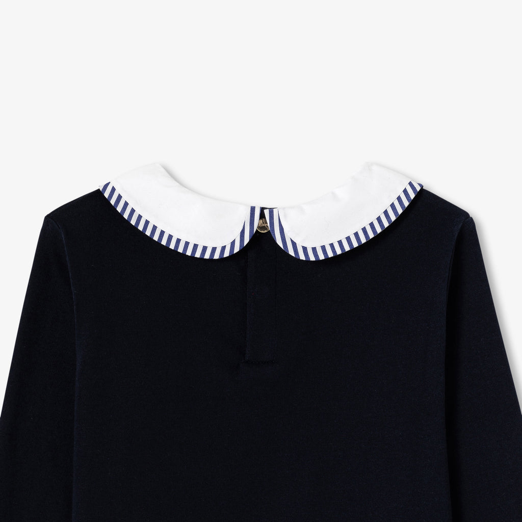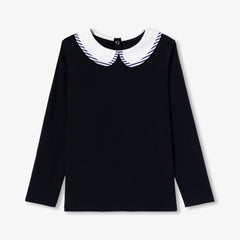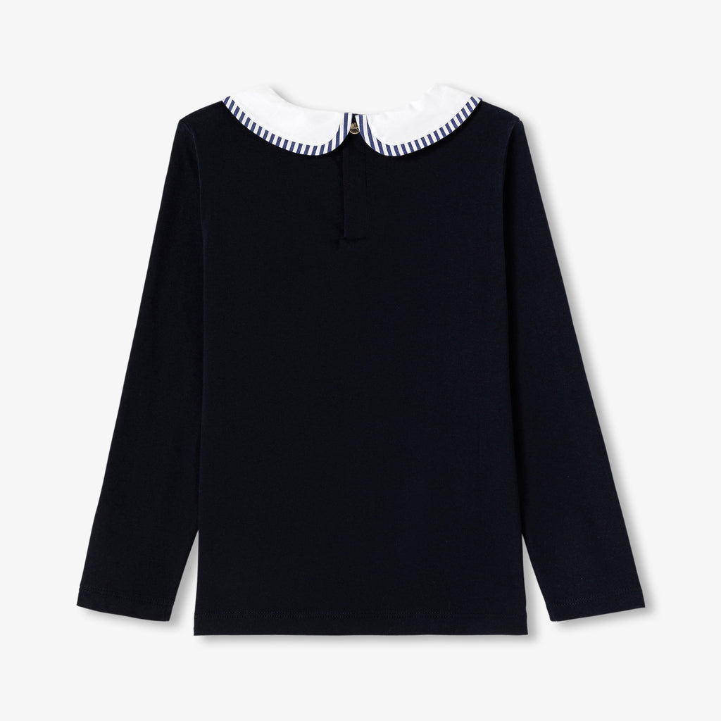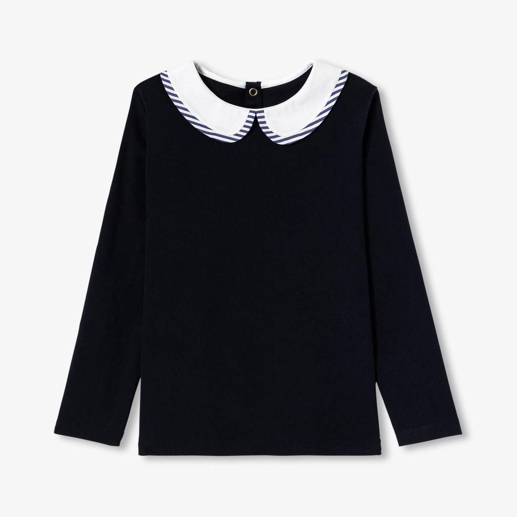 ポプリンのピーターパンカラー(襟)にコントラストの効いたストライプの縁取りをあしらった、シックな長袖Tシャツ。オーガニックコットンを使用した着やすいデザインです。ワイドレッグのジーンズやキュロット、ショートパンツと相性抜群の、通園・通学のワードローブの必需品です。