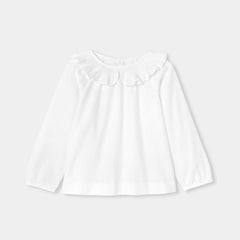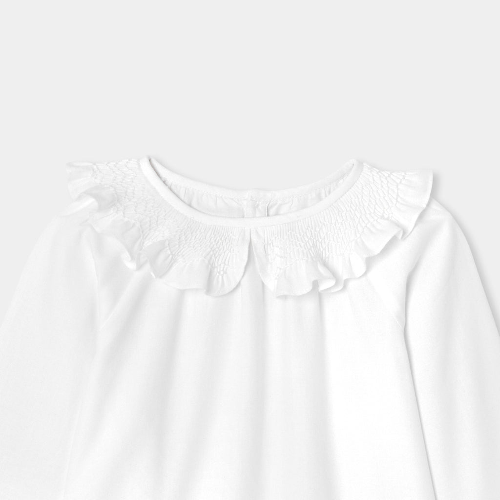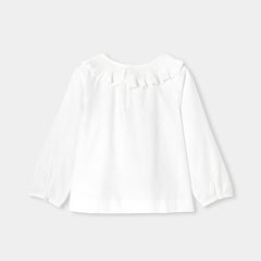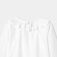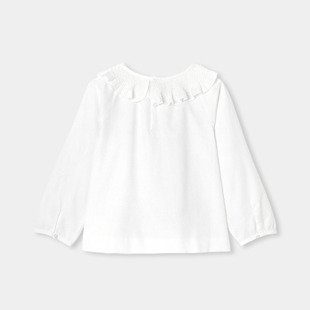 細部へのこだわりと洗練された仕上げが光るブラウス。秋のシックな装いを演出します。柔らかく、肌触りのよいコットンのフランネル調生地を使用し、同系色のスモック刺しゅうをあしらったエレガントなフリル襟が特徴の一着。ベロア調生地のワイドパンツやブリティッシュコートと好相性です。