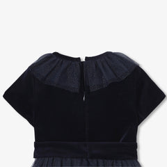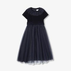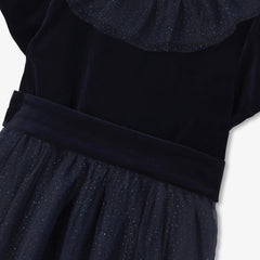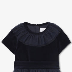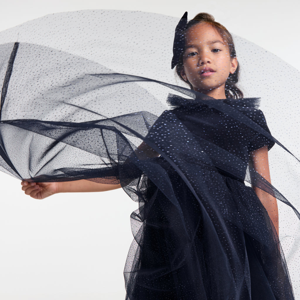 ジャカディのエレガンスと技術が詰まったワンピース。なめらかなベロア調生地のトップスとフリル、繊細なスパンコールがきらめくプリーツチュールがチャーミングです。特別な日にぴったりの一着です。ホリデーシーズンには、エナメルシューズとカーディガンを合わせて。