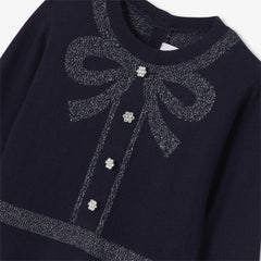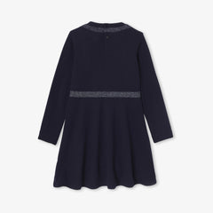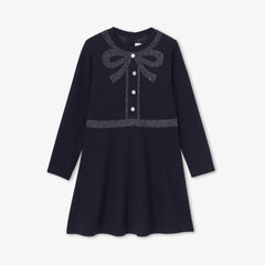 今シーズンは、冬のワンピースを、シックで幾何学的な美しさをまとったスタイルにリデザイン。レスポンシブルウールとカシミヤを使用し、シルバーのインターシャ織リボン風デザイン、切り替えウエスト、フレアの裾が、クチュールスタイルの魅力あふれる一着です。タイツとブーティを合わせれば、ホリデーシーズンにぴったり。