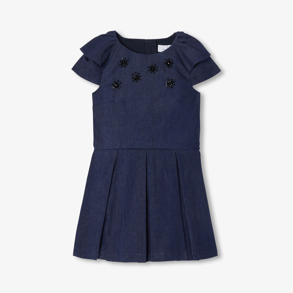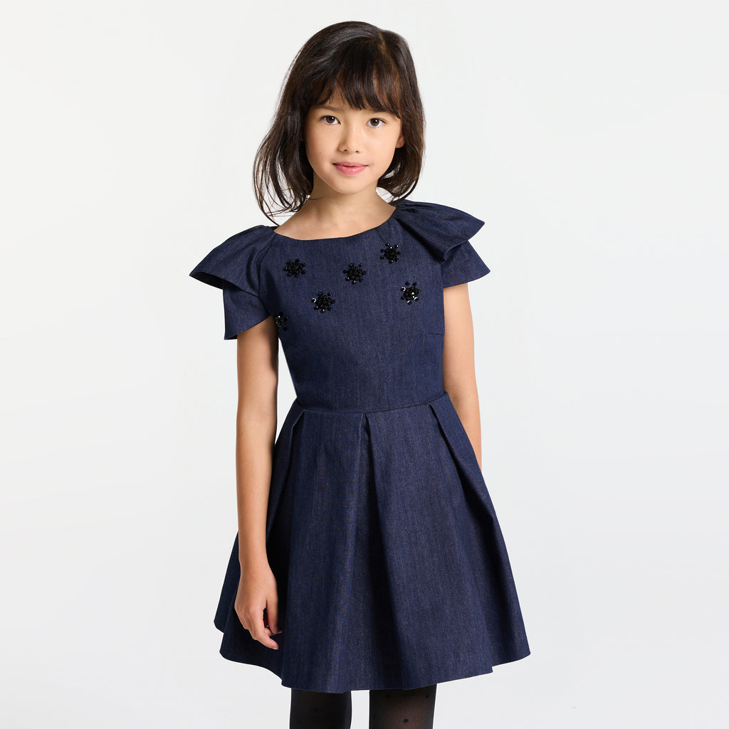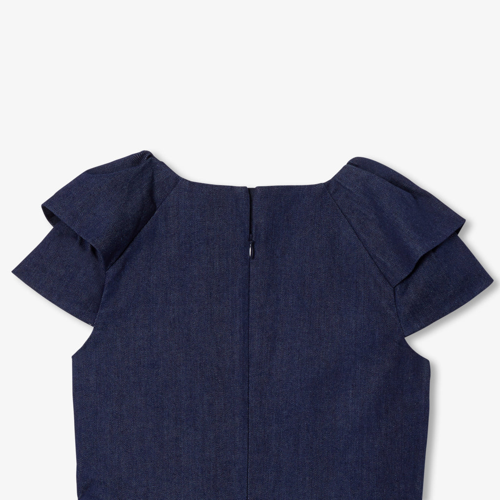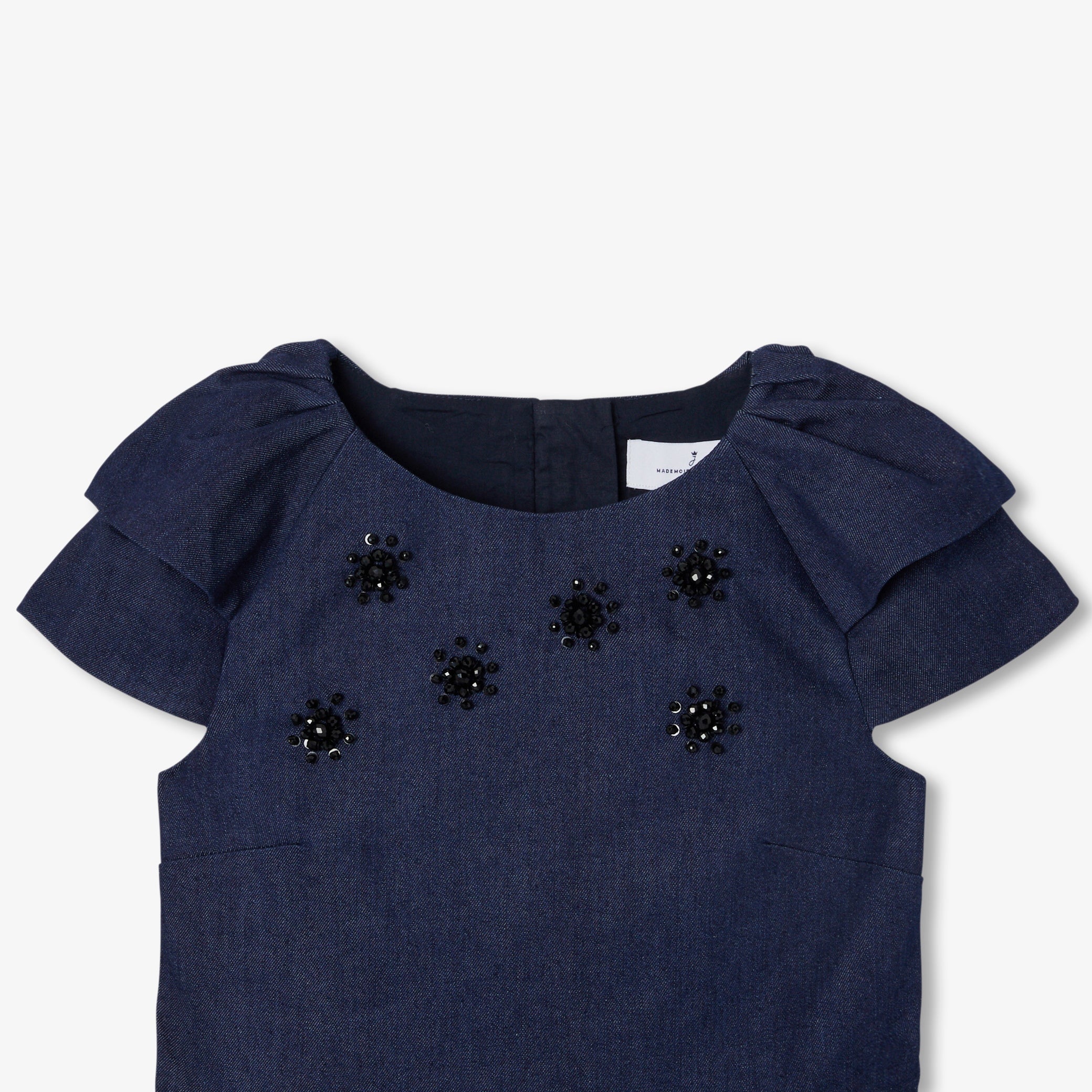 コレクションを象徴するリジッドデニム。オートクチュールの精神が宿るこのドレスは、まさに職人技(サヴォアフェール)の結晶です。同系色のビーズ刺繍が放つ気品ある煌めき、そして優雅に流れるようなウォーターフォールスリーブとプリーツスカートが、その美しさを一層際立たせています。細部にまでこだわり抜いた至高の一着が、洗練された日常を演出します。