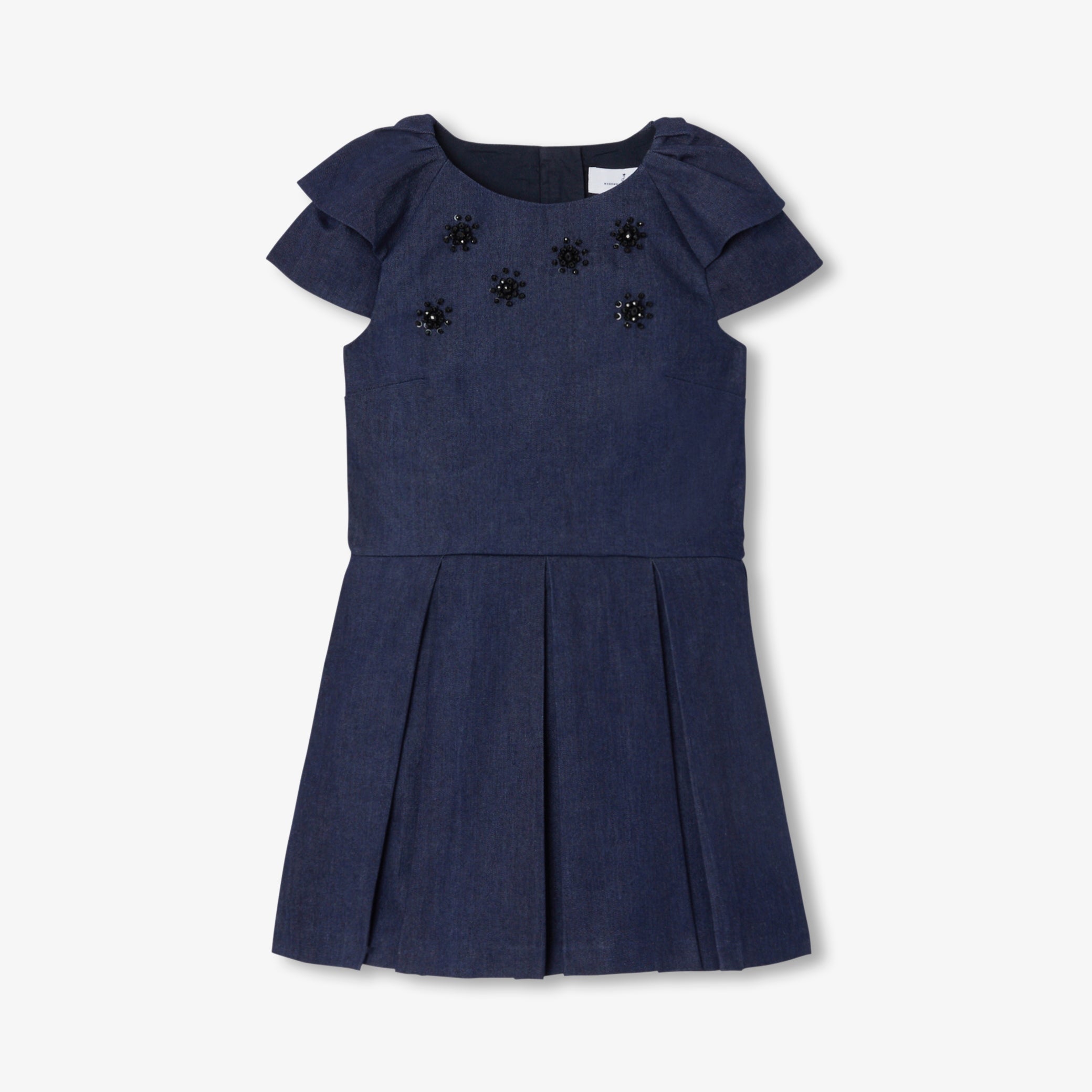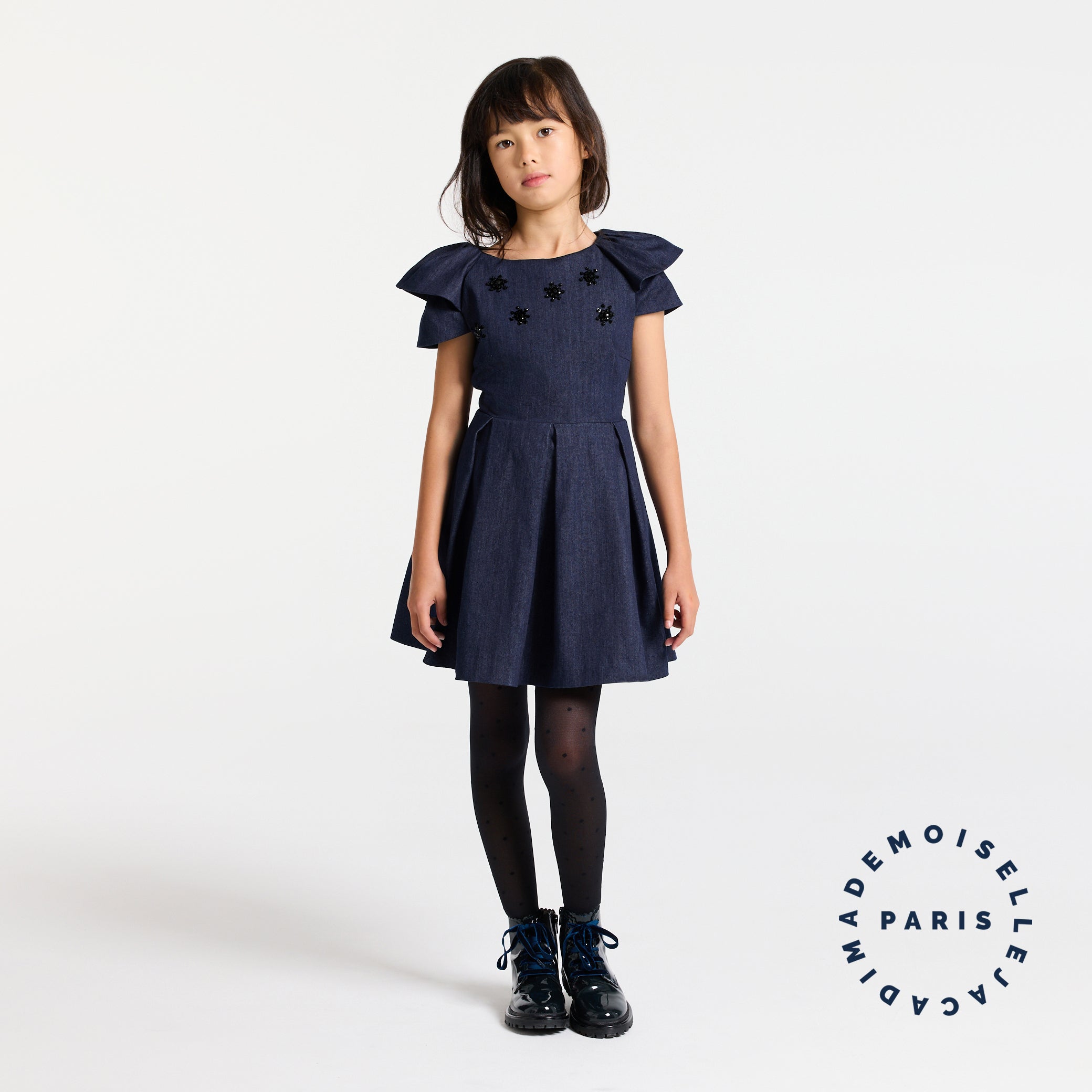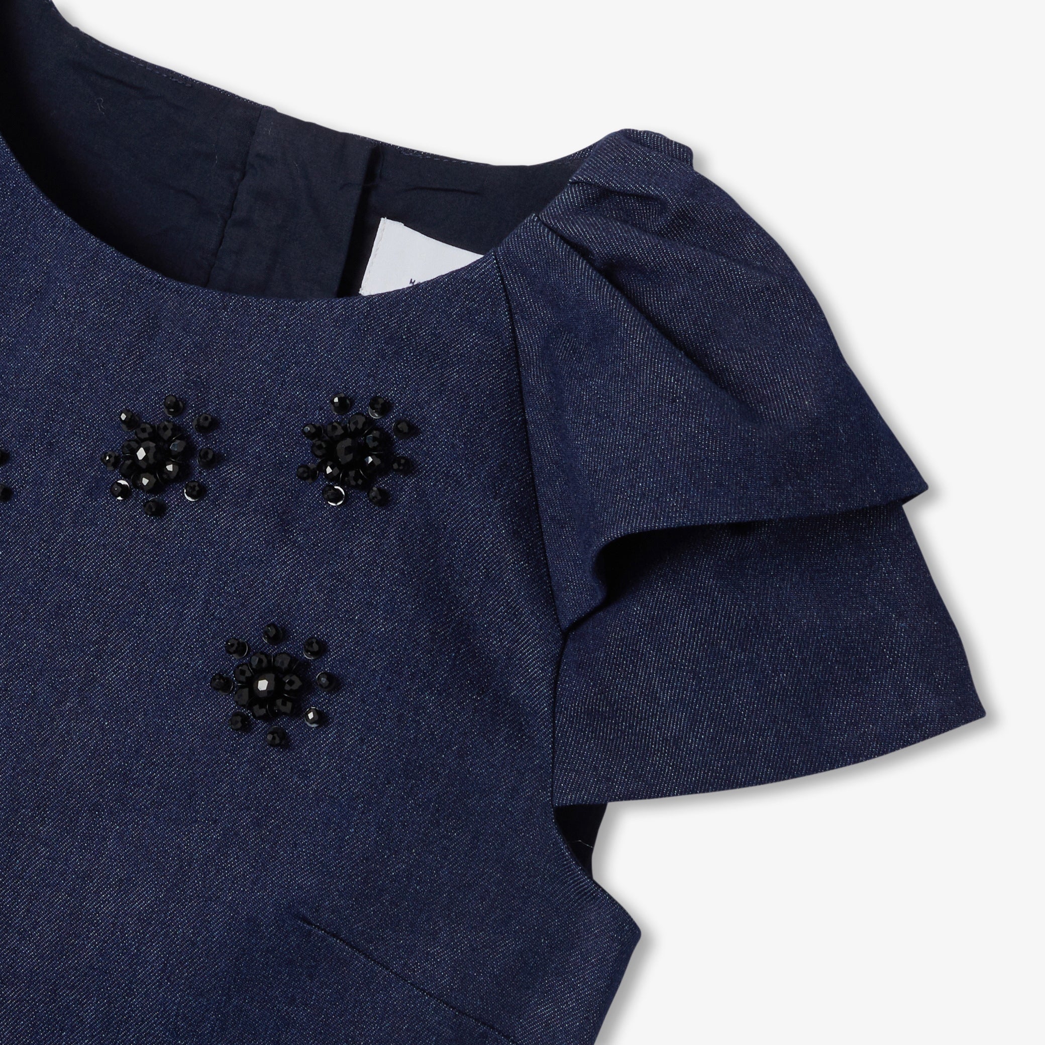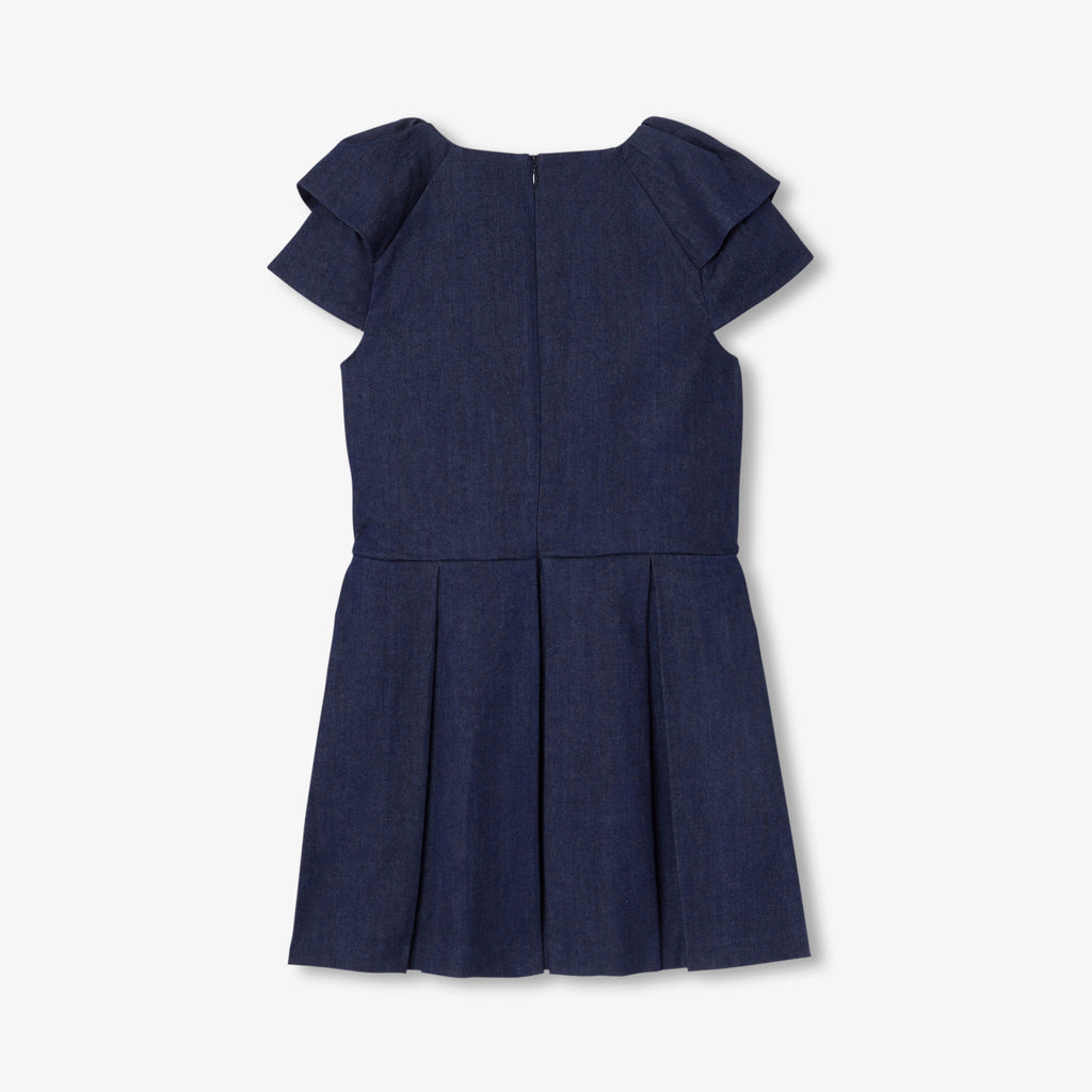 コレクションを象徴するリジッドデニム。オートクチュールの精神が宿るこのドレスは、まさに職人技(サヴォアフェール)の結晶です。同系色のビーズ刺繍が放つ気品ある煌めき、そして優雅に流れるようなウォーターフォールスリーブとプリーツスカートが、その美しさを一層際立たせています。細部にまでこだわり抜いた至高の一着が、洗練された日常を演出します。