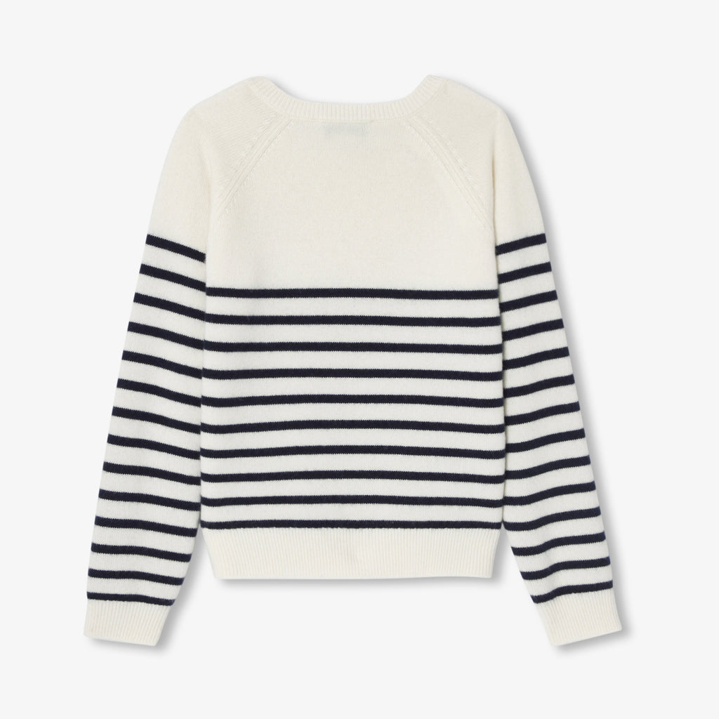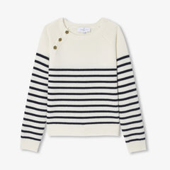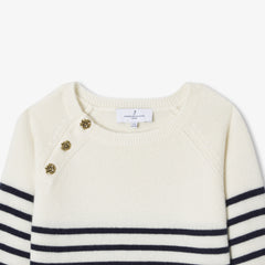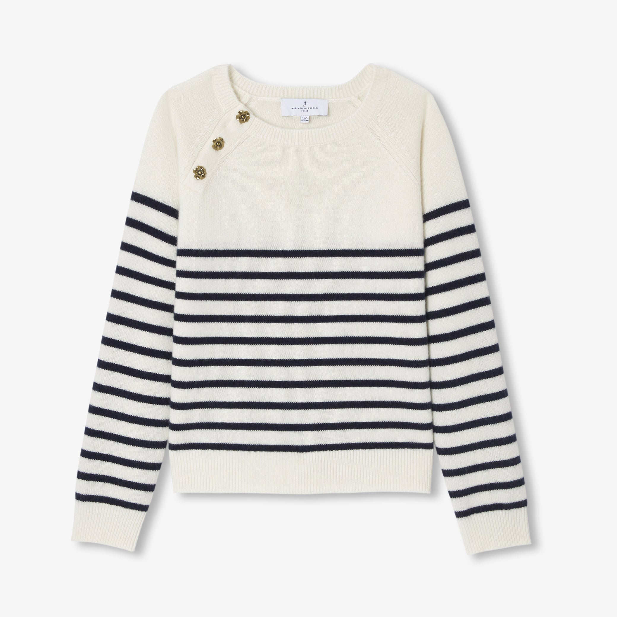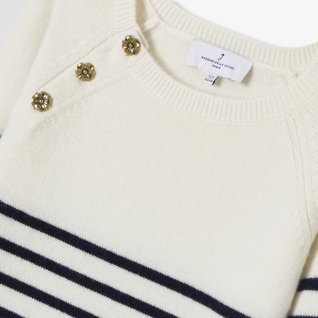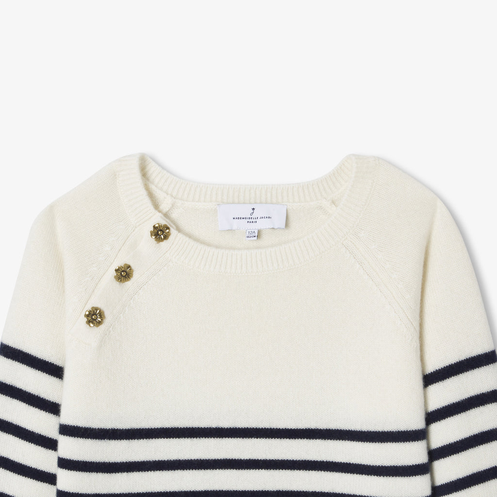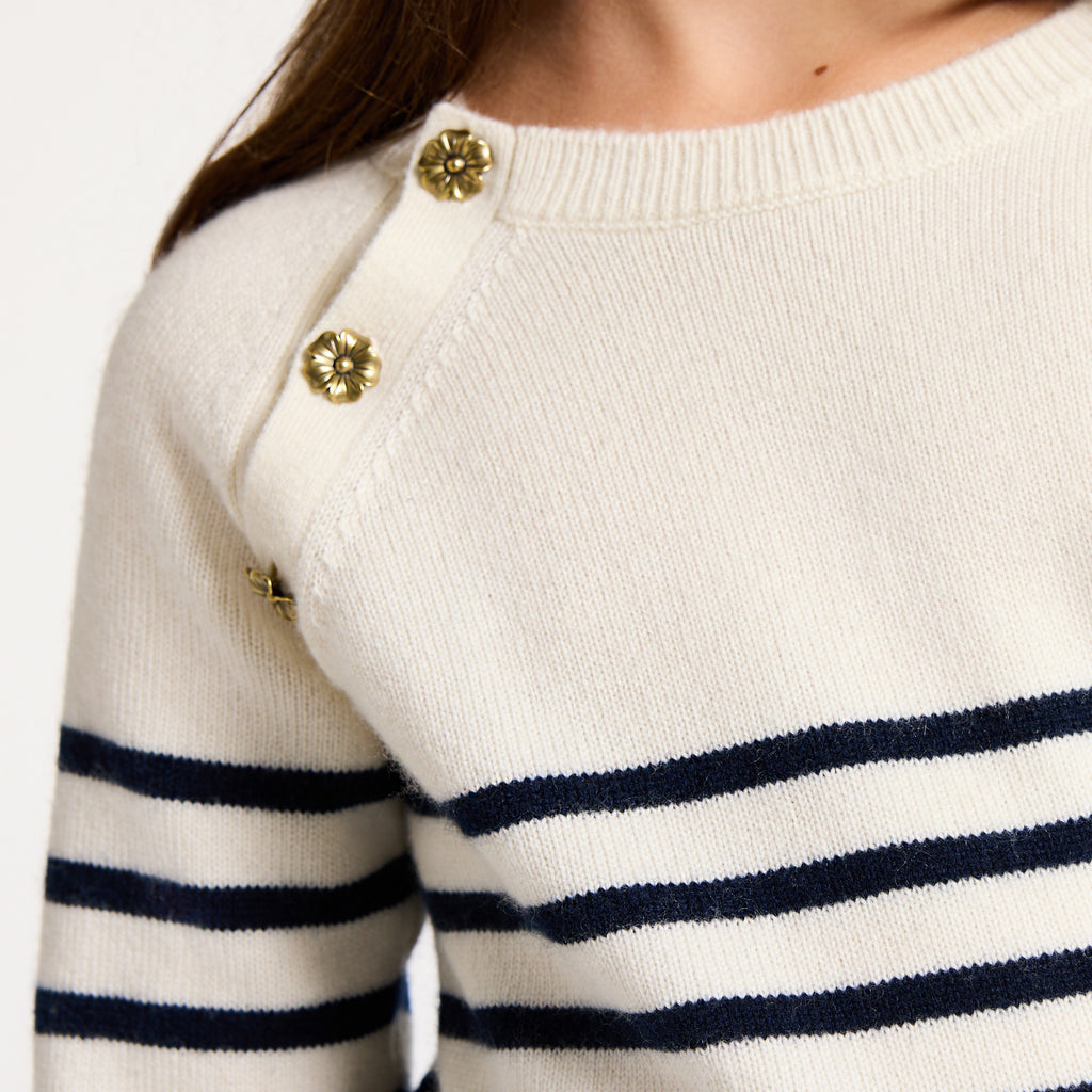 洗練されたネイビーブルーのボーダーに、ゴールドのお花ボタンが輝くラグランスリーブを合わせ、パリのエスプリ漂うシックなデザインに仕上げました。ワイドジーンズやウールコートと合わせれば、現代的な感性とエレガンス、そしてメゾンの職人技が息づく、完璧なバランスの着こなしが完成します。