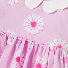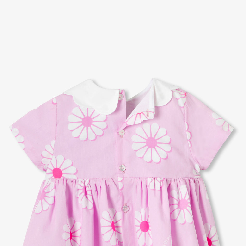 大きなデイジー柄と柔らかな色合いが、エレガントな中に遊び心を感じさせるワンピースです。スカラップのポプリン襟とギャザーを寄せたウエストが、軽やかなシルエットを描きます。幾何学的なデザインが、シックで心弾むデイリースタイルを演出します。